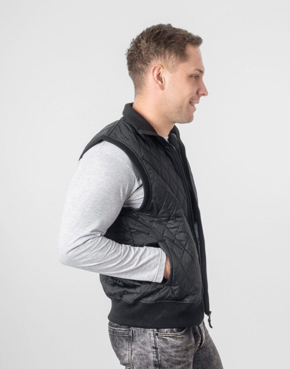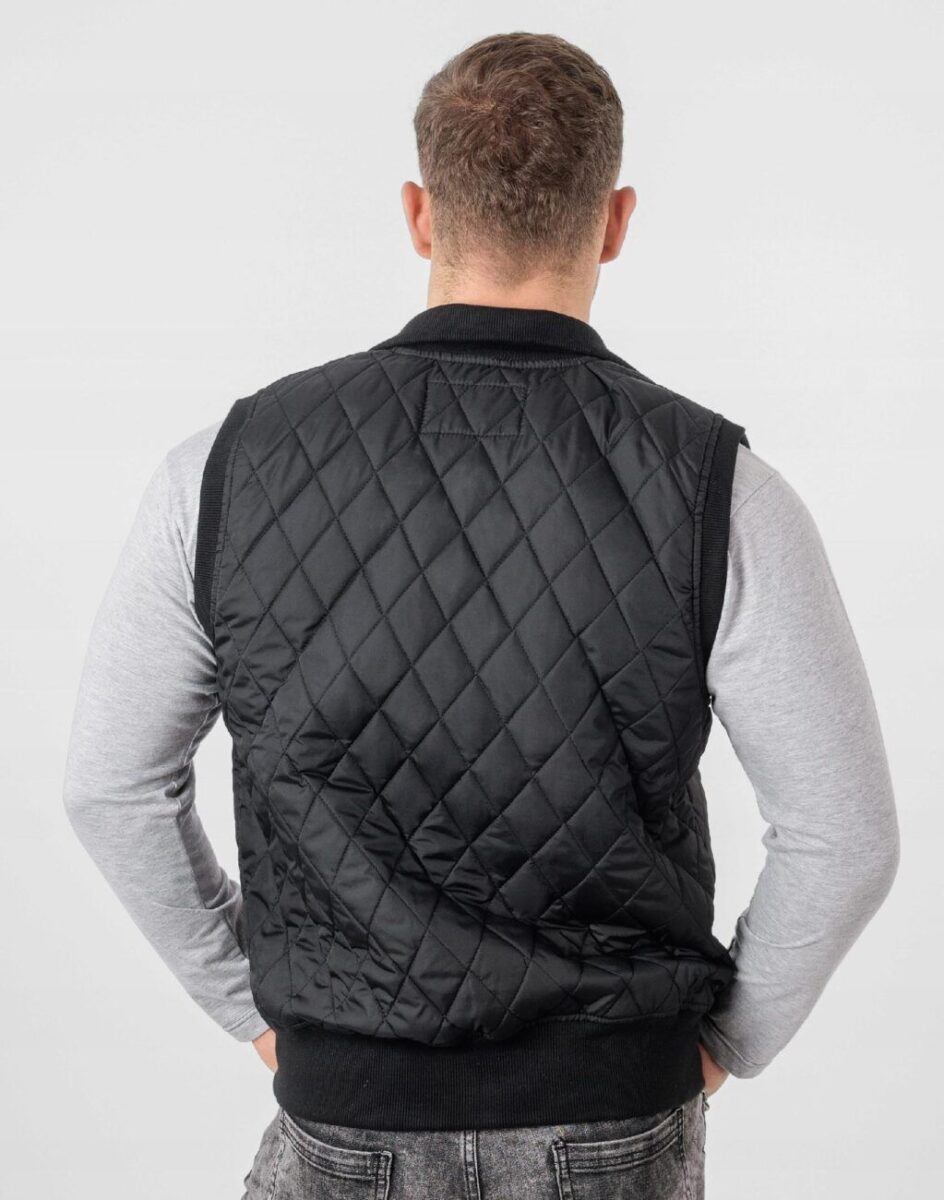 Kamizelka jest efektownie pikowana, zasuwana na zamek błyskawiczny i lekko ocieplona w całości puchem syntetycznym. Wysoki, elastyczny kołnierz/stójka zasłania szyję i chroni gardło, a często zastępuje nawet szalik co jest bardzo wygodne i skutecznie chroni przed zimnem i wiatrem. Z przodu kamizelki dwie wpuszczane kieszenie na dłonie a od wewnętrznej strony dwie duże kieszenie naszywane. Szeroki elastyczny ściągacz u dołu kamizelki i przy rękawach pozwala na precyzyjne dopasowanie jej do ciała, zapobiega utracie ciepła i skutecznie zapobiega przed dostawaniem się zimna od spodu kamizelki. Materiał zewnętrzny jest wiatroszczelny, posiada właściwości odpychające wodę i pikowany jest najmodniejsze obecnie charakterystyczne skośne romby. Wewnętrzna strona kamizelki wykończona jest pikowaną materiałową podszewką. Długość do bioder, która z powodzeniem zakrywa części ciała wrażliwe na chłód jak plecy na wysokości nerek.