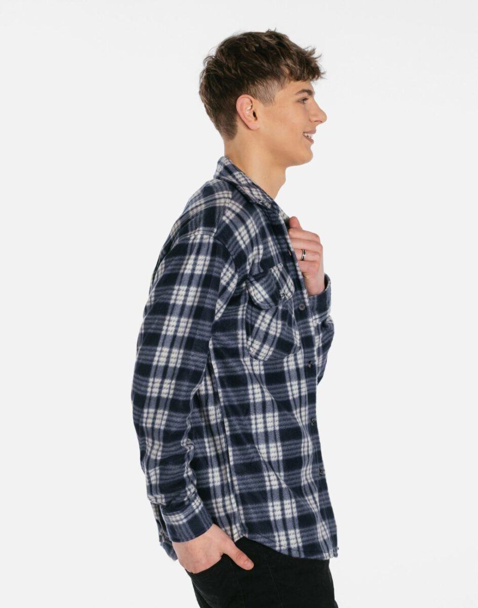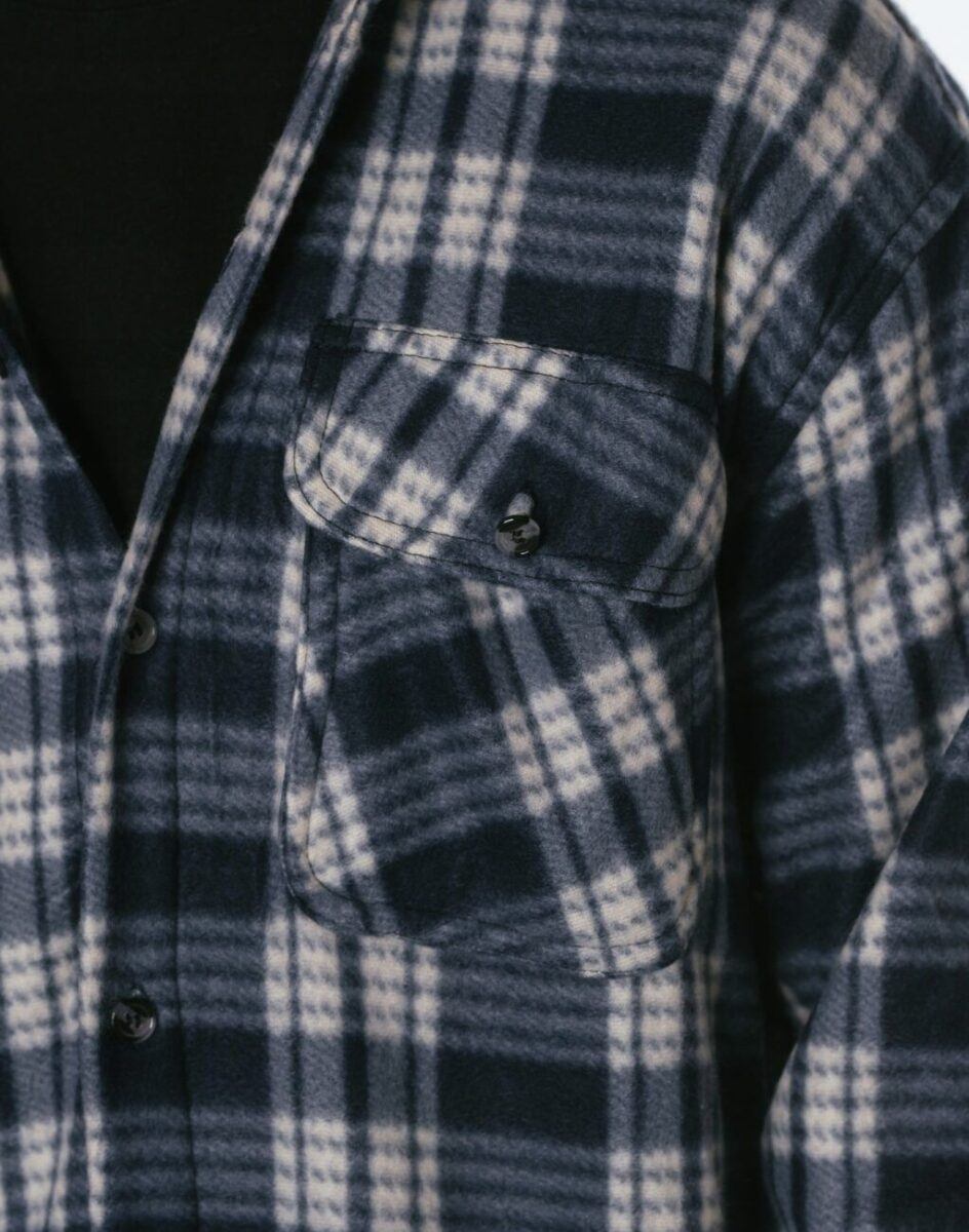 Koszula zapinana jest w całości na guziki. Na piersiach ma dwie kieszonki kryte patkami zapinanymi na guziki. Rękawy zakończone są mankietami zapinanymi również na guziki. Materiał polarowy jest wygodny w noszeniu, szybkoschnący i oddychający. Zapewnia bardzo przyjemny kontakt ze skórą oraz komfort cieplny. Fason typu regular wygodny, nie krepujący ruchów, odpowiednio wykrojony do noszenia na wierzchu.