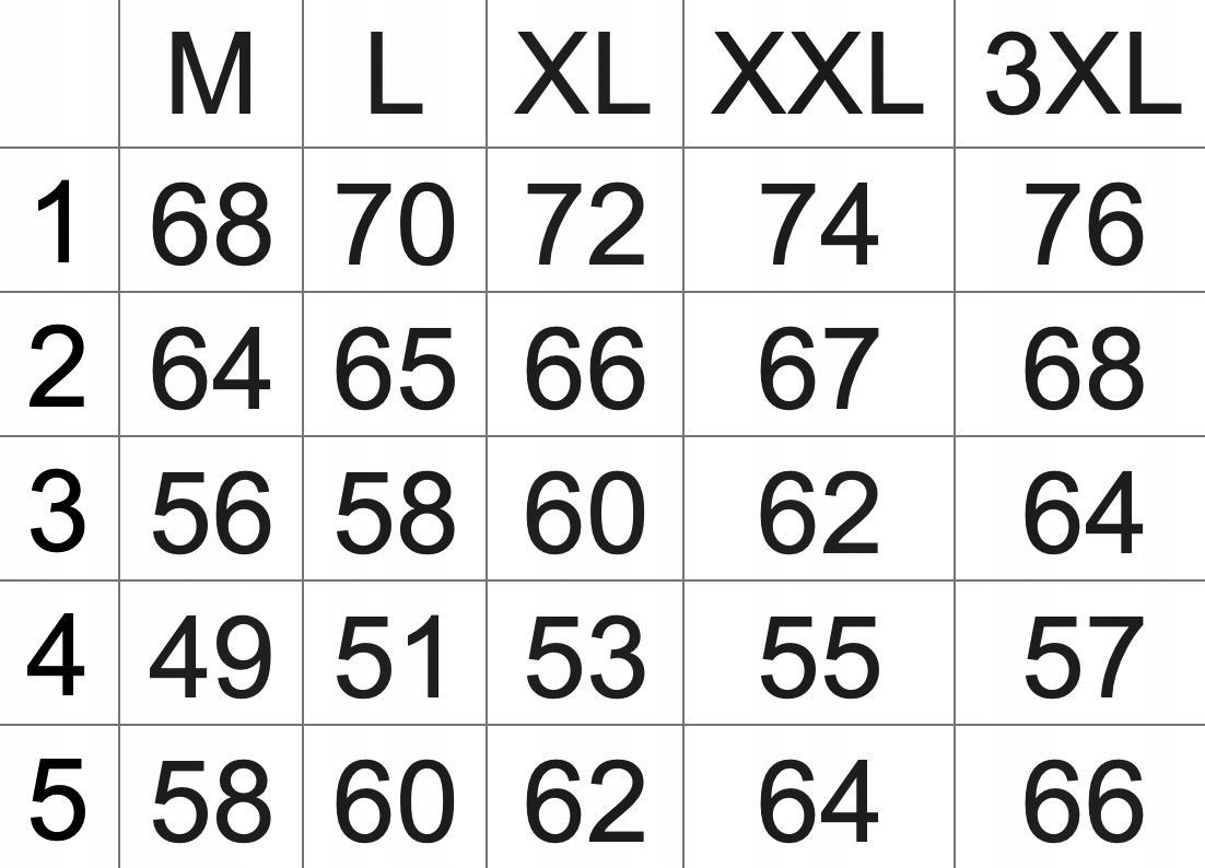 Proszę nie sugerować się rozmiarem podanym na metce przez producenta ( np: XL, 2XL czy 5XL) ponieważ różne firmy stosują bardzo różne oznaczenia rozmiaru na co my jako sprzedawcy na Allegro nie mamy żadnego wpływu. Najlepiej jest zmierzyć się dokładnie centymetrem a następnie porównać swoje wymiary z tabelą wymiarów podaną przez nas na aukcji i wybrać odpowiedni rozmiar.