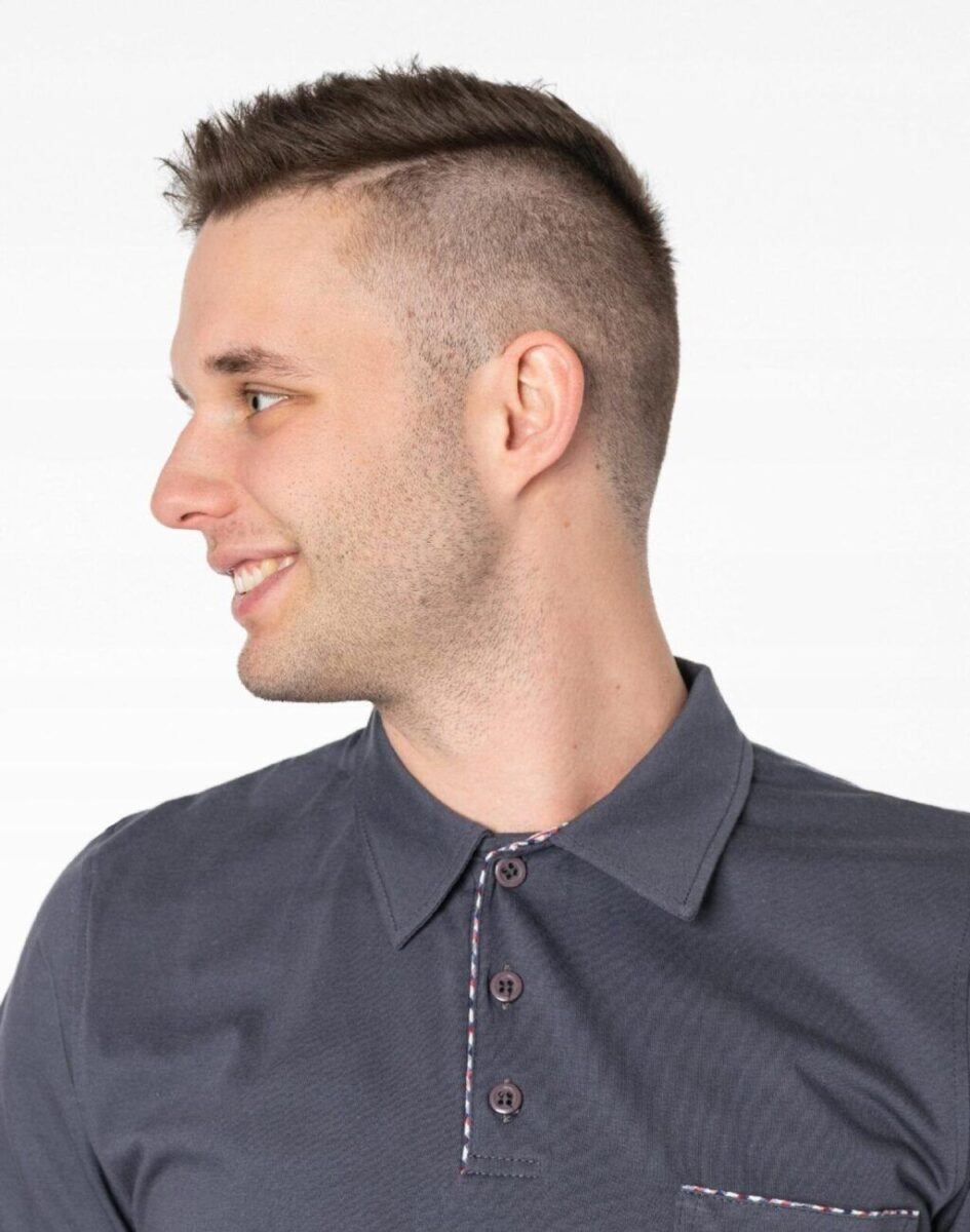 - Kołnierzyk typu polo zapinany na 3 guziki