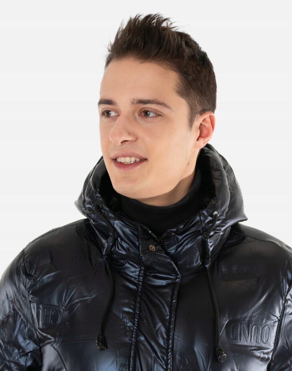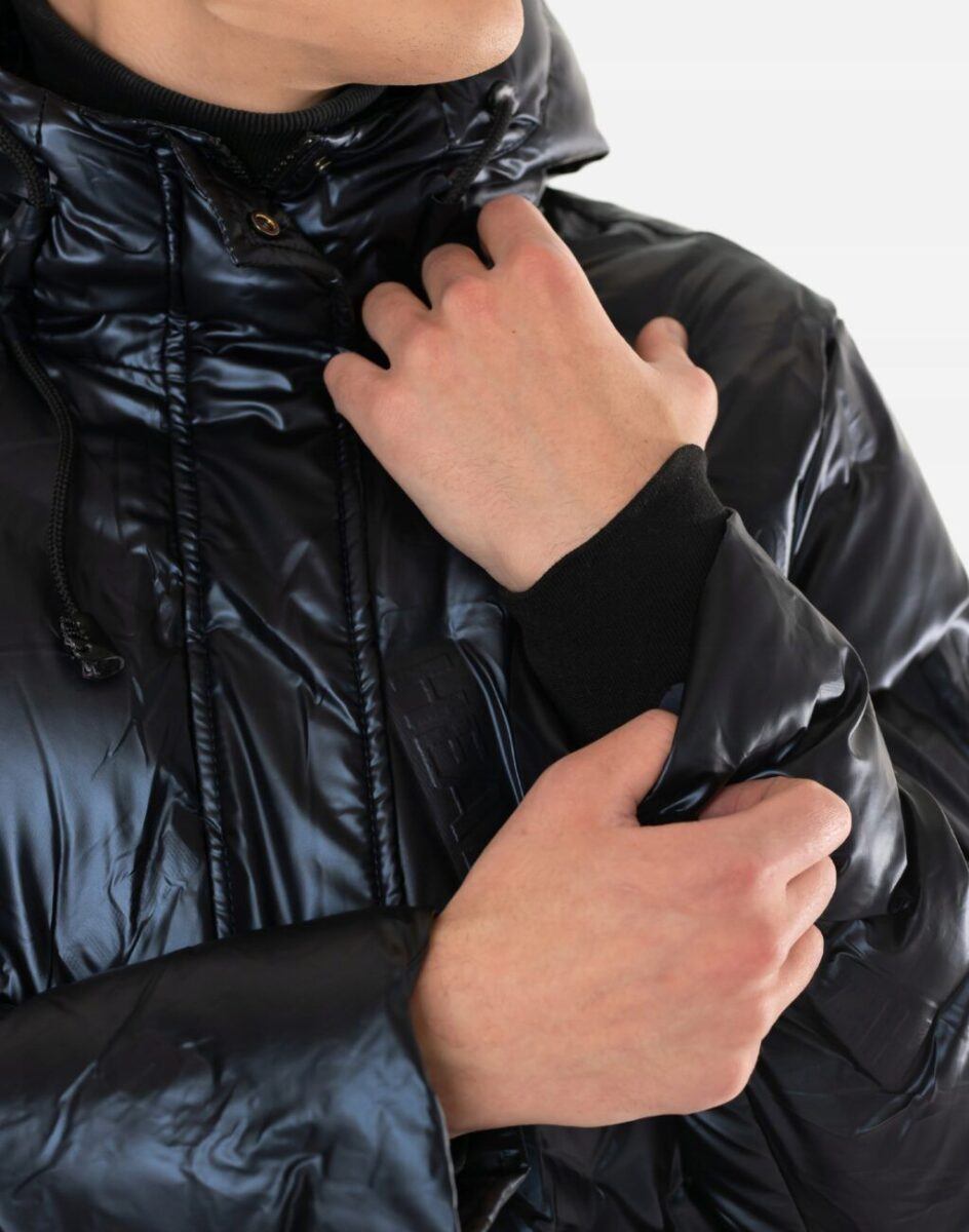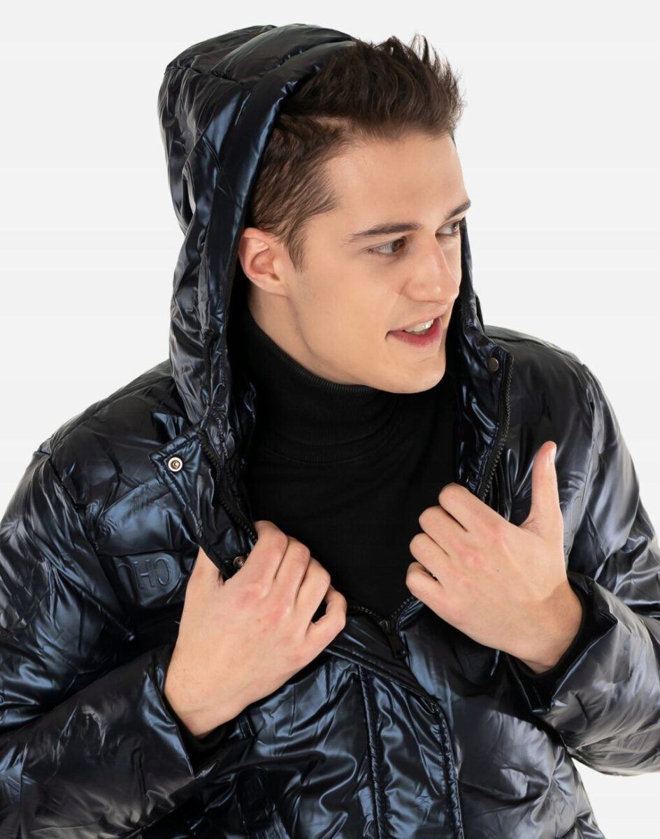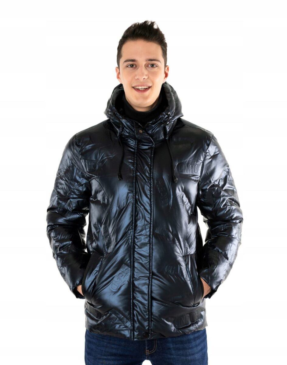 Ciepła Puchowa Kurtka Męska Wodoodporna i Wiatroszczelna z Kapturem i Modnym Połyskiem