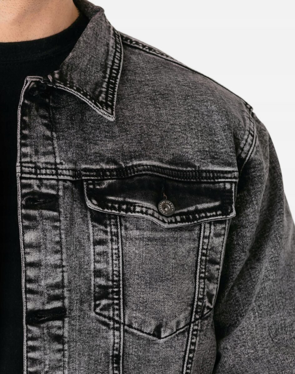Męska kurtka jeansowa o ponadczasowym, klasycznym kroju uszyta z jeansu w kolorze czarnym "Super Black" z fabrycznym efektem znoszonego, zniszczonego jeansu "used-look", w procesie produkcji poddana została specjalnym zabiegom postarzającym materiał polegającym to na wycieraniu, wielokrotnym wypieraniu barwnika i tworzeniu efektownych rozjaśnień i przetarć. Efektowne rozjaśnienia i wytarcia mają na celu wywołanie tak modnego efektu starej, długo noszonej, zużytej kurtki. Zapinana w całości na rząd guzików. Z przodu na piersi dwie naszywane kieszenie, kryte patkami i zapinane na metalowe guziki. Na bokach dwie wpuszczane kieszenie na dłonie a od wewnętrznej strony dwie duże kieszenie naszywane. Rękawy zakończone mankietami zapinanymi na guziki. Z tyłu na wysokości bioder regulacja szerokości i dopasowania. Nie krępuje ruchów i jest bardzo wygodna w noszeniu. Zaprojektowana została specjalnie dla wygody i długiego użytkowania z zachowaniem najwyższej jakości. Najbardziej podatne na uszkodzenia miejsca wzmocnione są dodatkowymi przeszyciami. Solidnie wykonana, niezwykle wytrzymała i odporna na rozdarcia, będzie Ci służyła przez wiele lat. Doskonała propozycja na okres wiosenny i jesienny oraz na chłodne letnie wieczory.