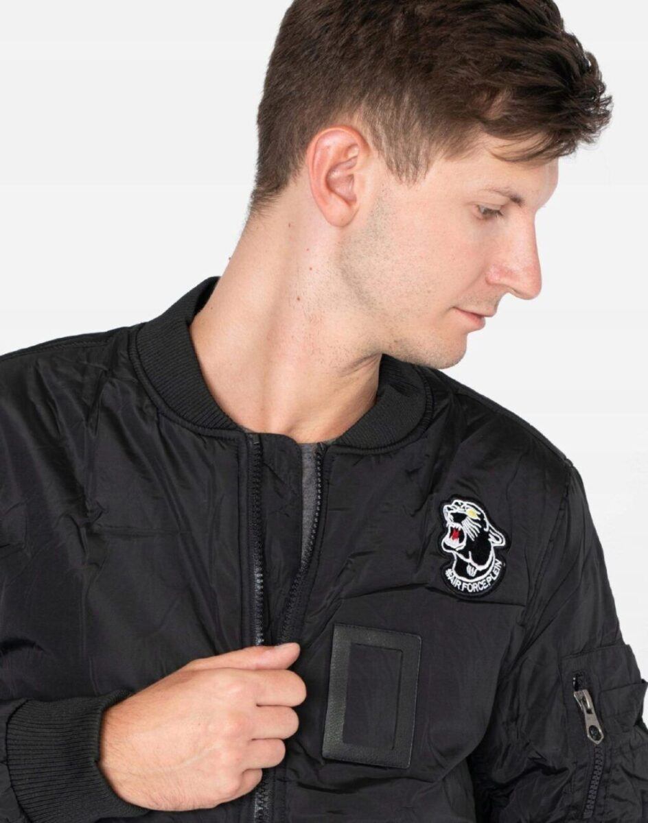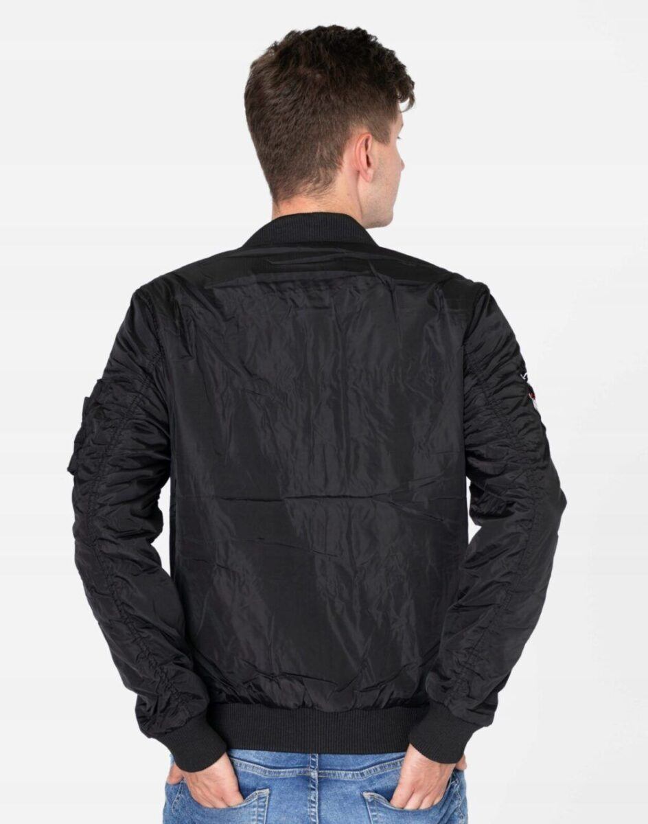Kurtka jest zasuwana na na zamek błyskawiczny i lekko ocieplona w całości puchem syntetycznym. Z przodu kurtki dwie wpuszczane kieszenie na dłonie. Na lewym rękawie kieszonka typu bomber zasuwana na suwak, wewnątrz kieszeń na portfel, dokumenty, telefon kom. itp. Szerokie elastyczne ściągacze u dołu kurtki przy szyi i rękawach pozwalają na precyzyjne dopasowanie do ciała, zapobiegają utracie ciepła i skutecznie chronią przed podmuchami wiatru. Efektowne firmowe naszywki dodają niepowtarzanego sportowo militarnego charakteru. Wykonana w całości z tkaniny poliesterowej o delikatnym połysku, zapewniającej wygodę i komfort termiczny użytkowania nawet w mniej sprzyjających warunkach pogodowych. Materiał zewnętrzny jest wiatroszczelny i posiada właściwości odpychające wodę. Wewnętrzna strona kurtki wykończona jest charakterystyczną dla „bomberek” pomarańczową podszewką.
