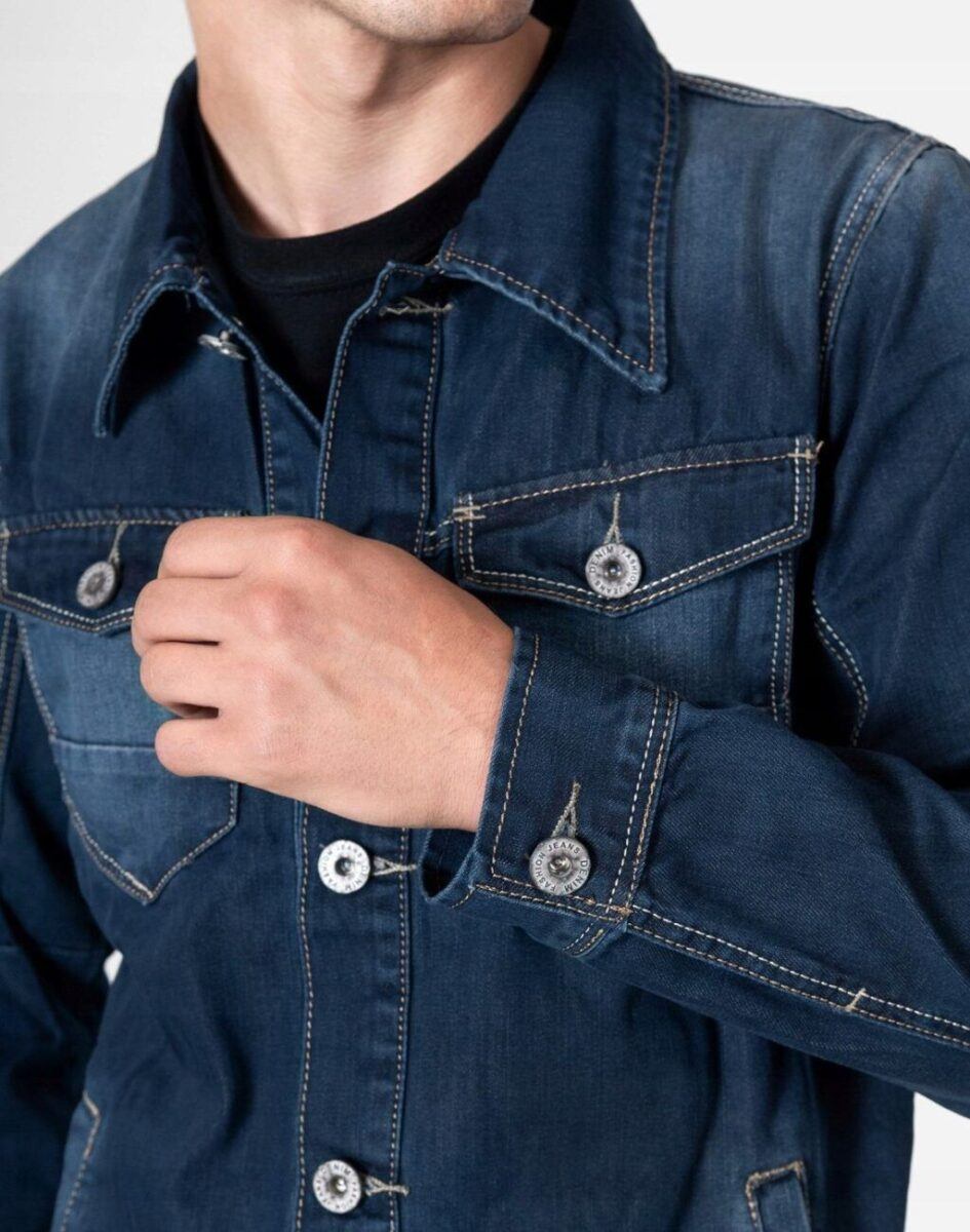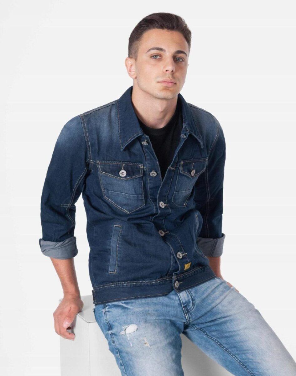 Męska kurtka jeansowa o ponadczasowym, klasycznym kroju uszyta z jeansu w kolorze granatowym „Dark Blue” w nieśmiertelnym stylu Vintage z modnym fabrycznym efektem sprania i przetarciami. Zapinana w całości na rząd guzików. Z przodu na piersi dwie kieszenie naszywane, kryte patkami i zapinane na metalowe guziki. Na bokach kurtki dwie wpuszczane kieszenie na dłonie a od wewnętrznej strony dwie kieszenie naszywane. Z tyłu na wysokości bioder regulacja szerokości i dopasowania. Nie krępuje ruchów i jest bardzo wygodna w noszeniu. Zaprojektowana została specjalnie dla wygody i długiego użytkowania z zachowaniem najwyższej jakości. Najbardziej podatne na uszkodzenia miejsca wzmocnione są dodatkowymi przeszyciami. Solidnie wykonana, niezwykle wytrzymała i odporna na rozdarcia, będzie Tobie służyła przez wiele lat.