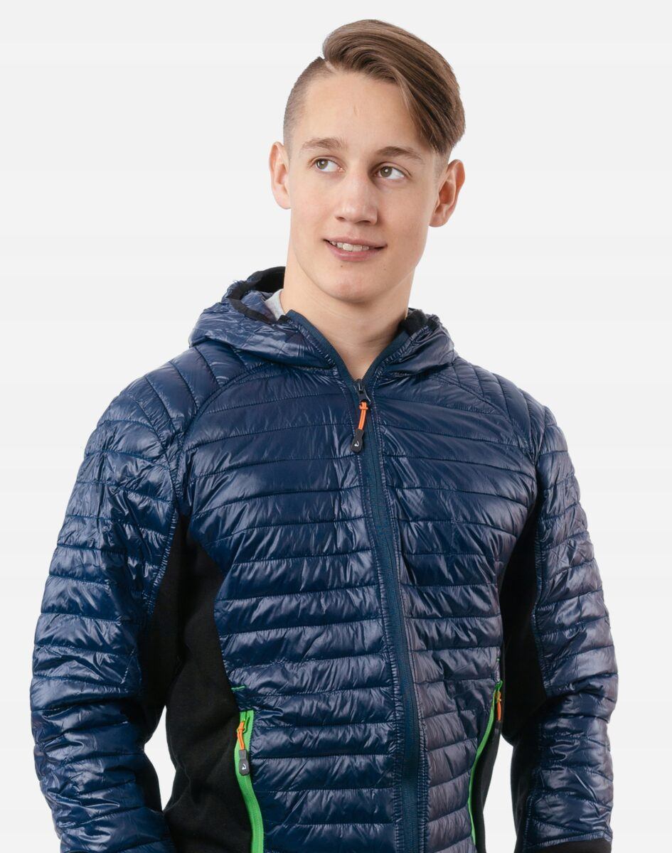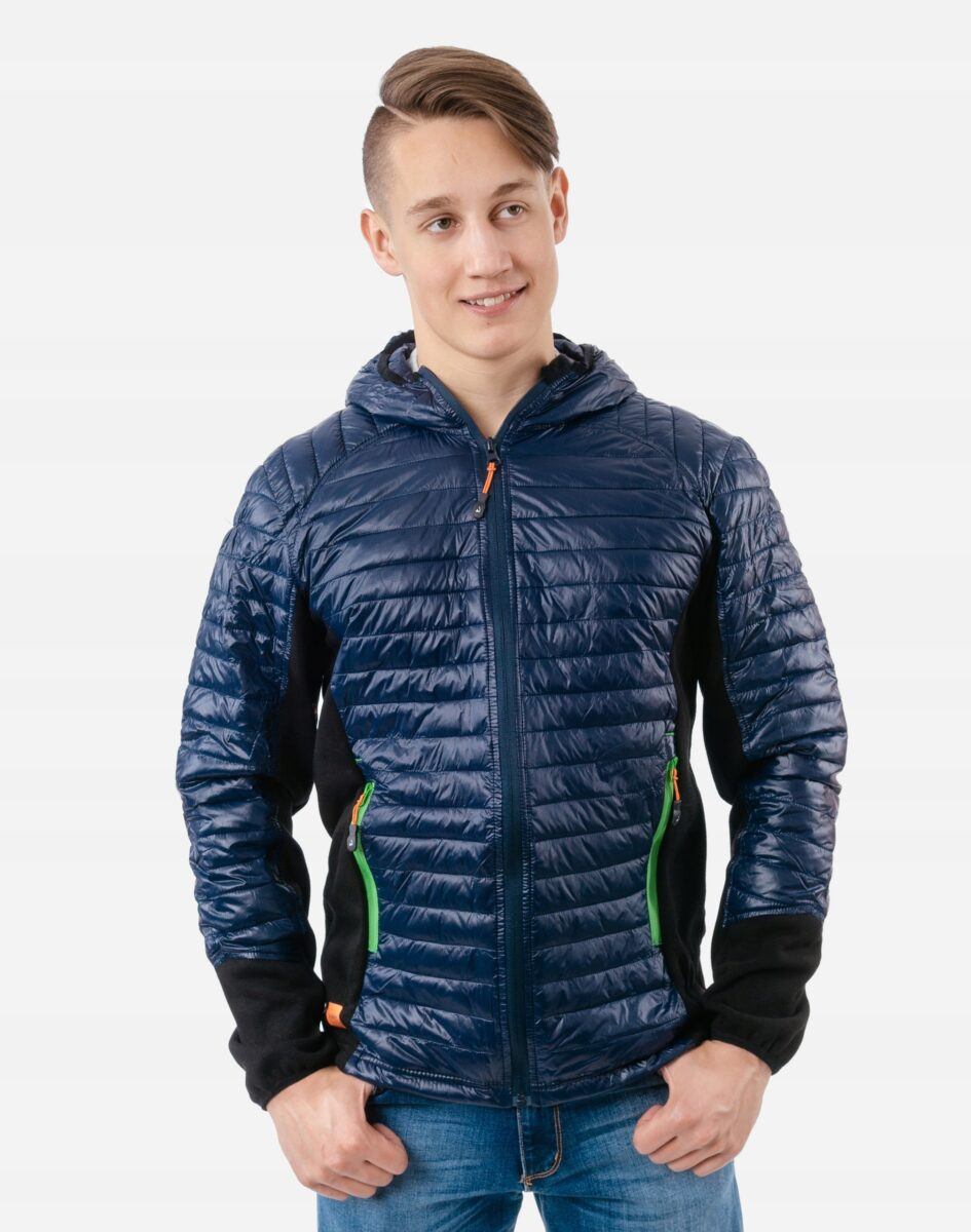 Kurtka sportowa TEMSTER efektownie pikowana i zasuwana w całości na zamek błyskawiczny. Z przodu lekko ocieplona pikowanymi panelami z puchem syntetycznym a od wewnętrznej strony miłym w dotyku i przyjemnym dla ciała delikatnym, cienkim futerkiem. Na bokach posiada dwie wpuszczane kieszenie na dłonie zasuwane na efektowne kolorowe zamki błyskawiczne a od wewnętrznej strony dwie duże kieszenie naszywane. Wysoki, ocieplony kołnierz/stójka połączony z kapturem skutecznie chroni podbródek i szyję a często zastępuje nawet szalik co jest bardzo wygodne. Praktyczny, lekko ocieplony zintegrowany kaptur skutecznie osłania głowę przed zimnem i wiatrem. Szerokość dołu kurtki regulowana jest ściągaczem ze stoperem natomiast rękawy oraz kaptur obszyte są elastyczną lamówką co pozwala na precyzyjne dopasowanie kurtki do ciała, zapobiega utracie ciepła i skutecznie chroni przed podmuchami wiatru. Modny układ pikowanych paneli został efektownie połączony ze wstawkami z gładkiej dzianiny tworząc najmodniejszy obecnie styl prezentowany szeroko na sportowych modowych blogach.