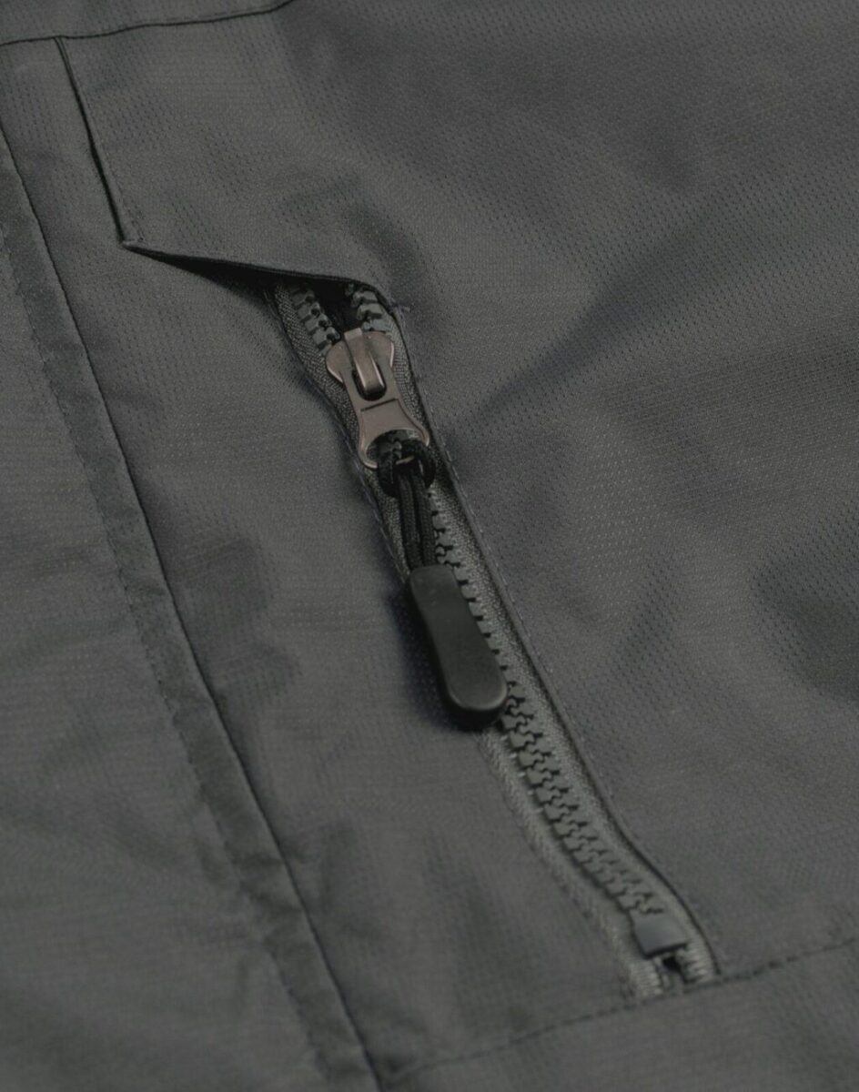 - Kieszenie: 2 wpuszczane kieszenie na dłonie zasuwane na zamki, kieszeń na lewej piersi zasuwana na zamek, na lewym przedramieniu kieszeń zasuwana na zamek, wewnętrzna kieszeń na portfel, dokumenty, telefon komórkowy MP3 itp. zapinana na rzepa