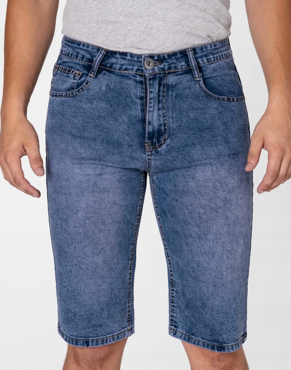 Krótkie bermudy jeansowe z modnym efektem sprania w stylu "used-look" to wygodne rozwiązanie na ciepłe, gorące dni i niezbędny element wakacyjnej garderoby dla mężczyzn z charakterem, który doskonale sprawdzi się podczas czasu wolnego. Cienkie i wygodne o sprawdzonym przez wielu naszych zadowolonych klientów kroju, idealne na co dzień jako element casualowego stroju, czyniąc go lekkim i dostosowanym do wysokich temperatur. Wygodny, luźny krój spodenek nie ogranicza swobody ruchów, a odpowiednia na wysokie temperatury niewielka gramatura tkaniny (260 g/m2) pozytywnie wpływa na komfort użytkowania. Wykonane według najnowszych modowych trendów przewidzianych na ten sezon zwracający na siebie uwagę modną kontrastową stębnówką, dodającą im oryginalności. Zapinane są na kryty zamek i metalowy guzik. Z przodu posiadają dwie wpuszczane kieszenie na dłonie oraz bilonówkę. Z tyłu dwie kieszenie naszywane jak w typowych spodenkach jeansowych. W pasie szlufki umożliwiające stylizacje z paskiem. Najmodniejsza obecnie długość "w kolano". Na nogawkach efektowne fabryczne przetarcia w modnym stylu "used-look". W procesie produkcji spodenki poddane zostały specjalnym zabiegom postarzającym materiał polegającym to na wycieraniu, wielokrotnym wypieraniu barwnika i tworzeniu efektownych pomięć i przetarć. Efektowne rozjaśnienia i wytarcia mają na celu wywołanie tak modnego efektu "OldVintage" czyli długo noszonych, spranych jeansów. Najbardziej podatne na uszkodzenia miejsca wzmocnione są dodatkowymi przeszyciami i ozdobnymi metalowymi nitami.