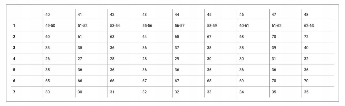 rozmiarszerokość w pasie (cm)szerokość w biodrach (cm)szerokość w udzie (cm)szerokość na dole nogawki (cm)długość nogawki od kroku (cm)długość nogawki zewnętrzna (cm)wysokość pasa (cm)