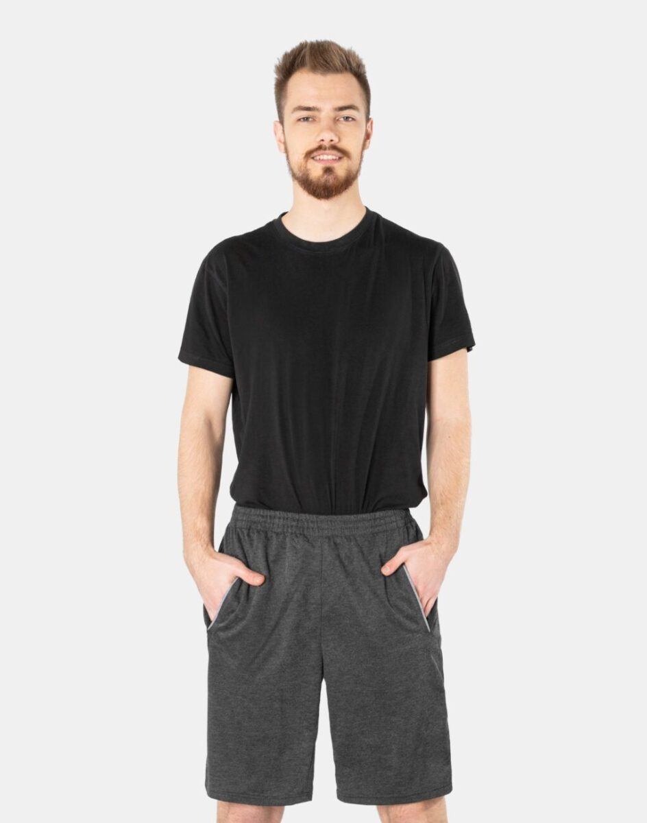 Uszyte z naturalnej, miękkiej, ekologicznej bawełny o gramaturze 240 g/m2 gwarantującej świetną przepuszczalność powietrza, wchłanianie potu i oddychanie skóry. Dodatek poliestru zapewnia pełną swobodę ruchów oraz stabilności rozmiarów i koloru po wielokrotnym praniu. Ergonomiczny krój spodenek nie ogranicza swobody ruchów, a właściwe dla odzieży sportowej proporcje surowcowe i wysokiej jakości dzianina dresowa pozytywnie wpływa na komfort użytkowania zapewniając dobrą cyrkulację powietrza. Idealne na co dzień jako element domowego stroju, jak również na ciepłe i gorące dni wiosny i lata. Świetne sprawdzają się na siłowni, wakacyjnych wyjazdach, podczas uprawiania różnych dyscyplin sportowych i rekreacji.