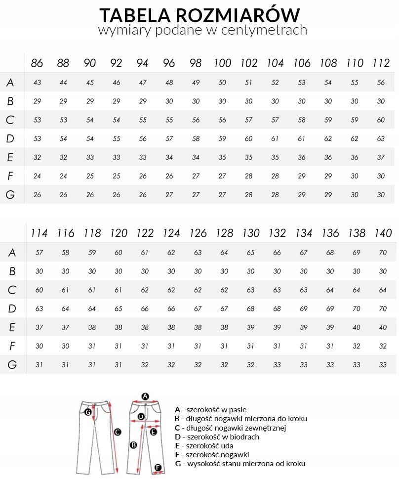 Zapinane na zamek błyskawiczny i guzik. Z przodu klasyczne wpuszczane kieszenie zaokrąglone, z tyłu kieszenie nakładane. Najbardziej podatne na uszkodzenia miejsca wzmocnione są dodatkowymi przeszyciami oraz nitami.