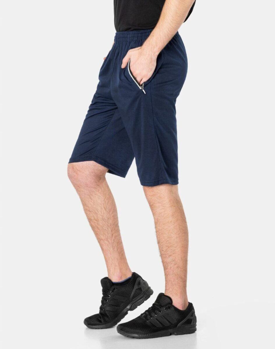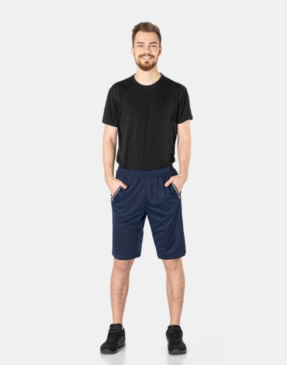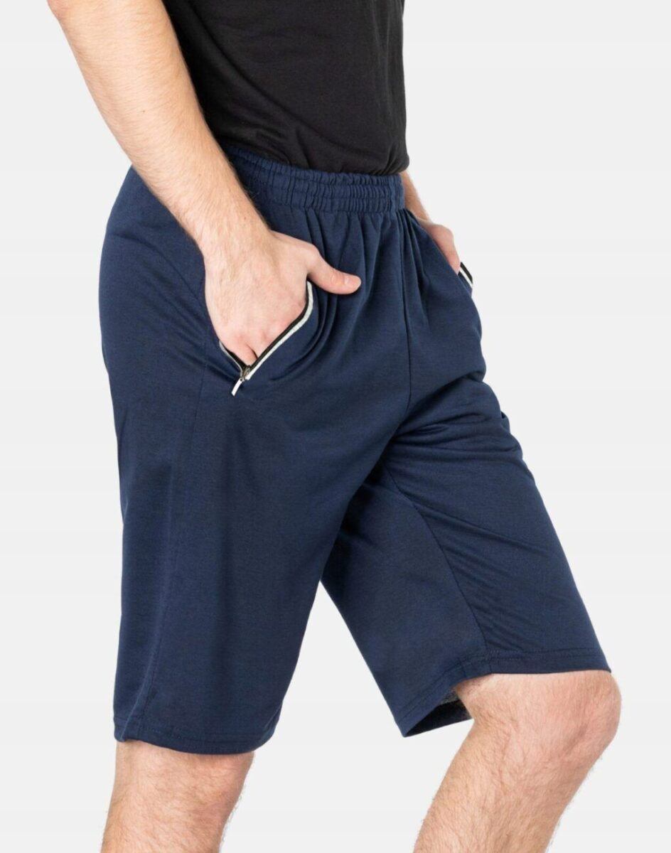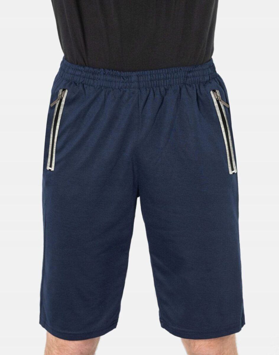 Krótkie sportowe spodenki męskie 6377, to komfortowo skrojony model z luźną nogawką przed kolano. Z założenia wyróżniają się dużą wygodą, a dopasowanie w pasie zapewnia szeroki elastyczny pas ściągający oraz dodatkowo wpuszczona w pasek taśma regulacyjna z możliwością jej zawiązywania. Na bokach mają dwie wpuszczane kieszenie na dłonie zasuwane na zamki błyskawiczne.
