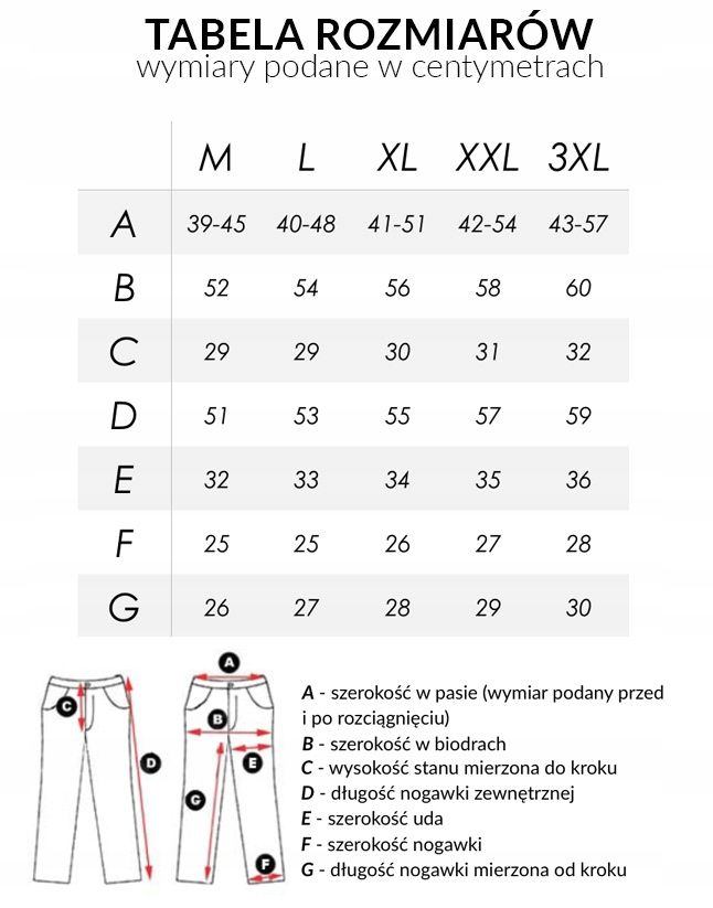 Z założenia wyróżniają się dużą wygodą, dopasowanie w pasie zapewnia szeroki elastyczny ściągacz oraz dodatkowo wpuszczona w pasek taśma regulacyjna z możliwością jej zawiązywania. Na bokach dwie wpuszczane kieszenie na dłonie, zasuwane na ozdobne zamki błyskawiczne. Tył gładki bez kieszeni. Komfortowy swobodny krój.