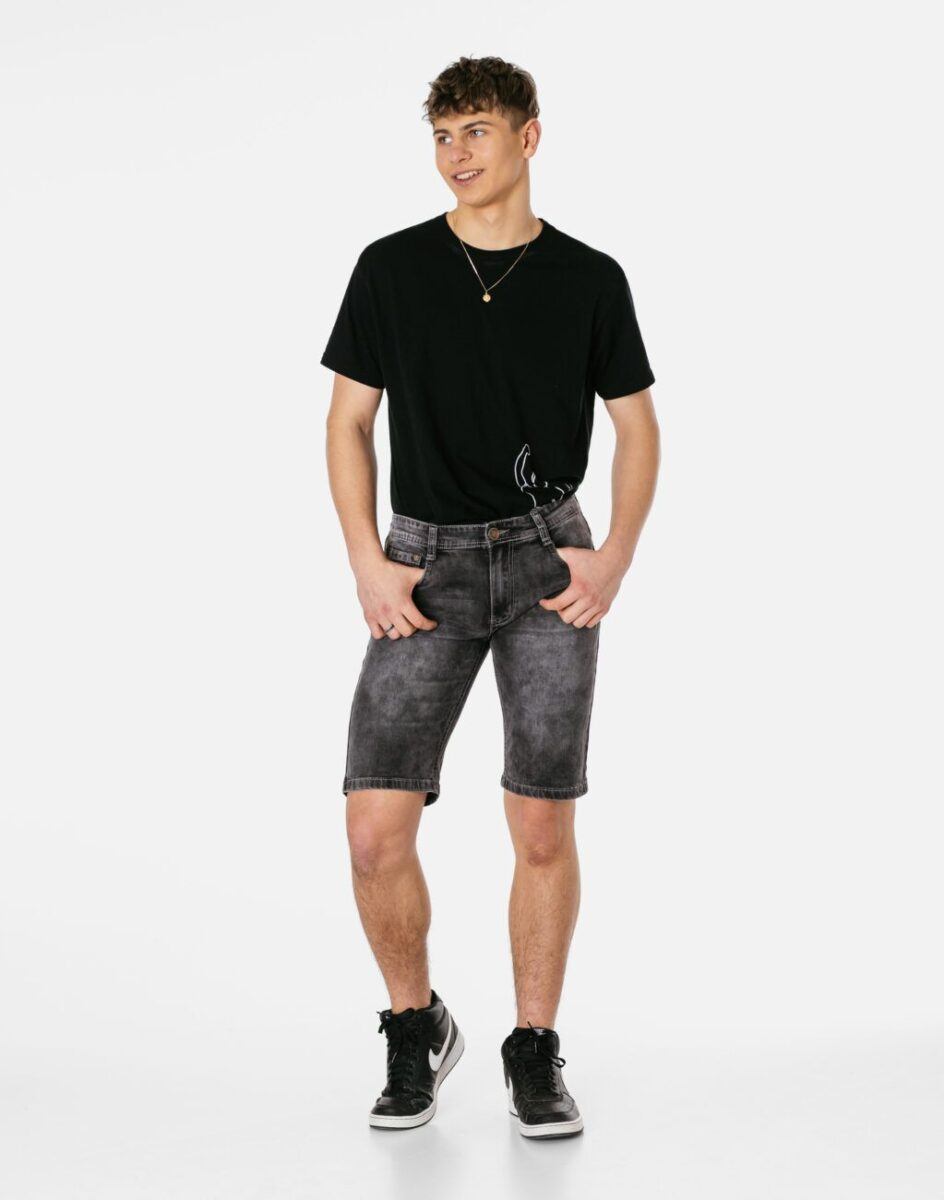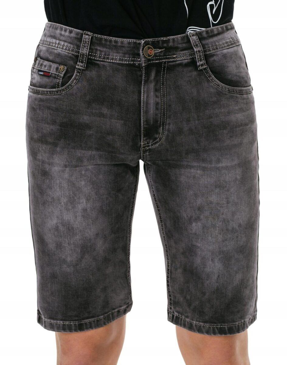 Krótkie spodenki jeansowe z fabrycznym efektem znoszonego, zniszczonego jeansu w stylu „used-look” to wygodne rozwiązanie na ciepłe, gorące dni i niezbędny element wakacyjnej garderoby do tworzenia udanych letnich stylizacji. W procesie produkcji poddane zostały specjalnym zabiegom postarzającym materiał polegającym na wycieraniu, wielokrotnym wypieraniu barwnika i tworzeniu efektownych pomięć i przetarć mających na celu wywołanie tak modnego efektu starych, długo noszonych, zużytych jeansów. Wykonane z wysokiej jakości gęstej, trwałej i mocnej tkaniny jeansowej „Denim Dark Grey” z modnym efektem sprania i przetarciami w nieśmiertelnym stylu „Vintage”. Niewielki dodatek spandexu (lycra) sprawia, że spodenki są bardziej elastyczne co pozwala na pełną swobodę ruchów, daje komfort przy siadaniu i zapewnia ogromny komfort noszenia. Wygodne o sprawdzonym przez wielu zadowolonych klientów kroju, idealne na co dzień jako element casualowego stroju czyniąc go lekkim i dostosowanym do wysokich temperatur. Z przodu posiadają dwie wpuszczane kieszenie na dłonie oraz bilonówkę. Z tyłu dwie kieszenie naszywane. W pasie szlufki umożliwiające stylizacje z paskiem. Najmodniejsza obecnie długość „przed kolano”. Najbardziej podatne na uszkodzenia miejsca wzmocnione są dodatkowymi przeszyciami i ozdobnymi metalowymi nitami.