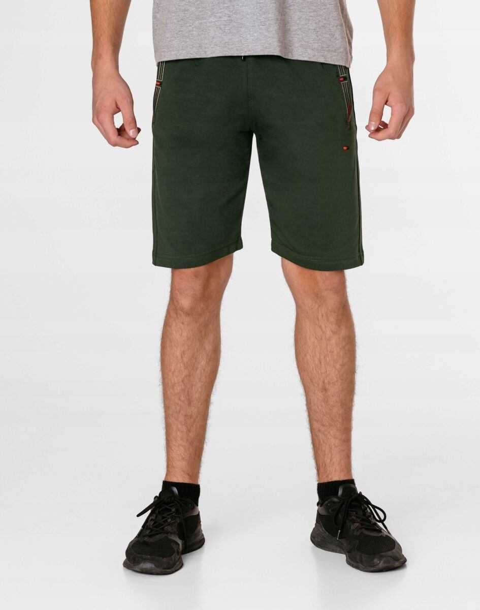 Krótkie sportowe spodenki męskie 1522#, to komfortowo skrojony model z luźną nogawką przed kolano. Z założenia wyróżniają się dużą wygodą, a dopasowanie w pasie zapewnia szeroki elastyczny pas ściągający oraz dodatkowo wpuszczona w pasek taśma regulacyjna z możliwością jej zawiązywania. Na bokach mają dwie wpuszczane kieszenie na dłonie zasuwane na zamki błyskawiczne, z tyłu jedna wpuszczana kieszeń zasuwana na kryty zamek błyskawiczny.