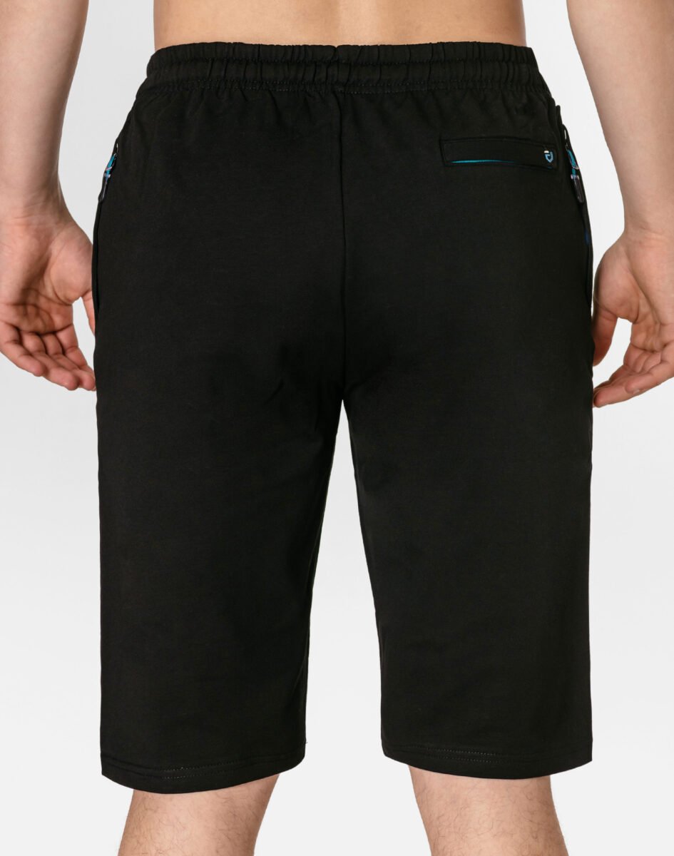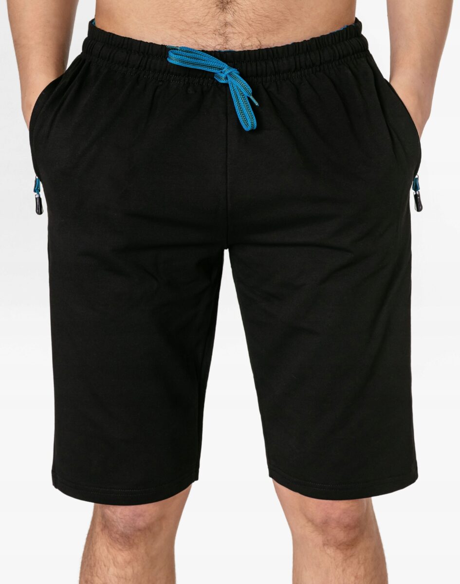Krótkie sportowe spodenki męskie 4306#, to komfortowo skrojony model z luźną nogawką o długości w kolano. Z założenia wyróżniają się dużą wygodą, a dopasowanie w pasie zapewnia szeroki elastyczny pas ściągający oraz dodatkowo wpuszczona w pasek ozdobna taśma regulacyjna z możliwością jej zawiązywania. Na bokach mają dwie wpuszczane kieszenie na dłonie zasuwane na kryte zamki błyskawiczne, z tyłu jedna wpuszczana kieszeń zasuwana również na kryty zamek błyskawiczny.