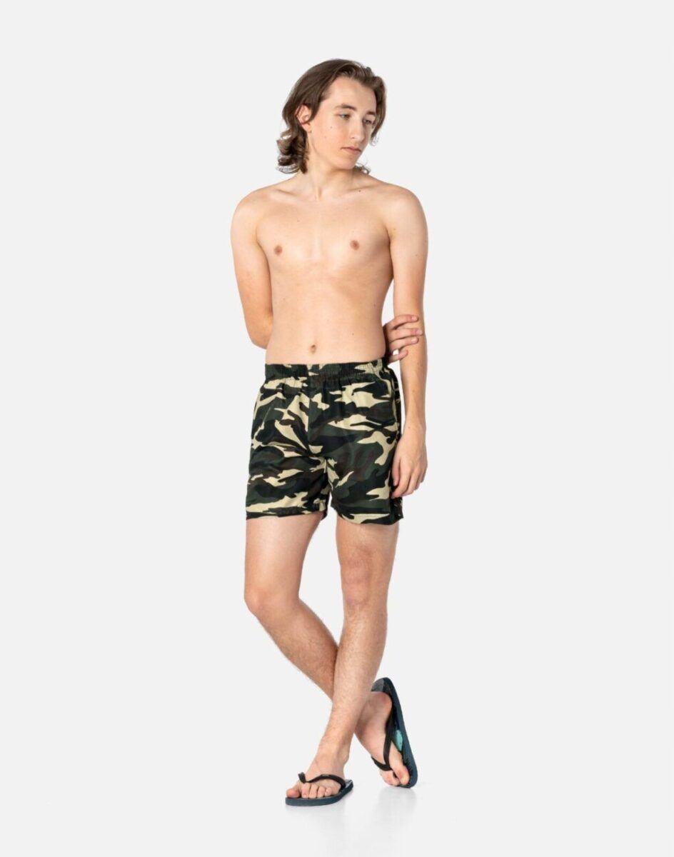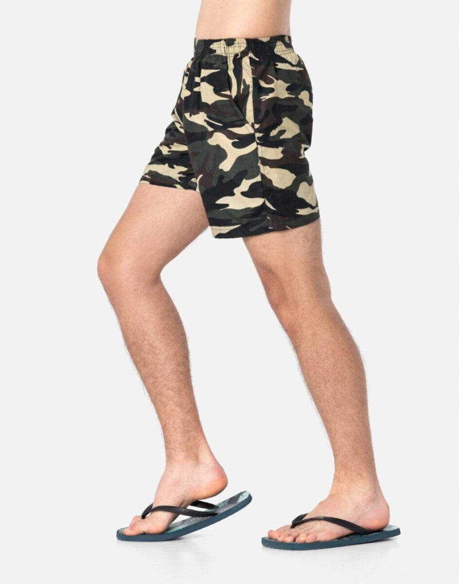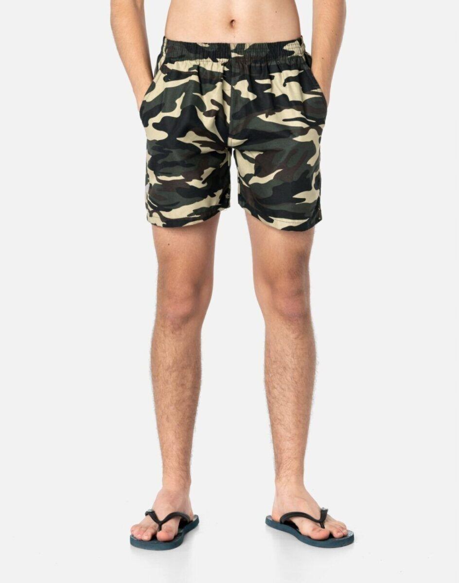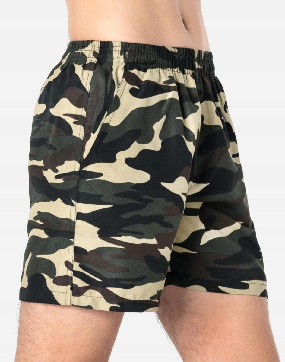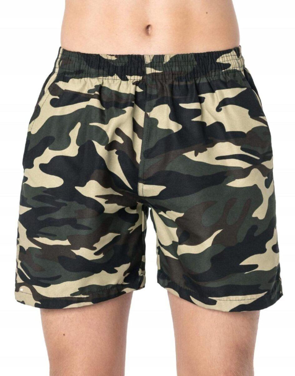 W tym sezonie trwa moda na krótkie sportowe spodenki w najmodniejszym w tym sezonie wzorze moro CAMO dla fanów militarnego stylu sport-casual z luźnymi nogawkami typu szorty. Wyjątkowo męskie, lekkie jak piórko, szorty kąpielowe DK 340 moro idealne na ciepłe i gorące letnie dni. Genialne jako sportowe spodenki kąpielowe będą też pasować do wakacyjnych stylizacji z T-shirtem albo przewiewnym tank topem lub koszulką polo. Wystarczy założyć klapki, t-shirt z nadrukiem, aby bez skrępowania wybrać się do pobliskiej restauracji. Są o wiele bardziej wygodne od klasycznych kąpielówek ponieważ luźne nogawki dają poczucie komfortu, niewymuszonego luzu i wygody, nie opinają ciała i nadają dobre proporcje męskiej sylwetce.