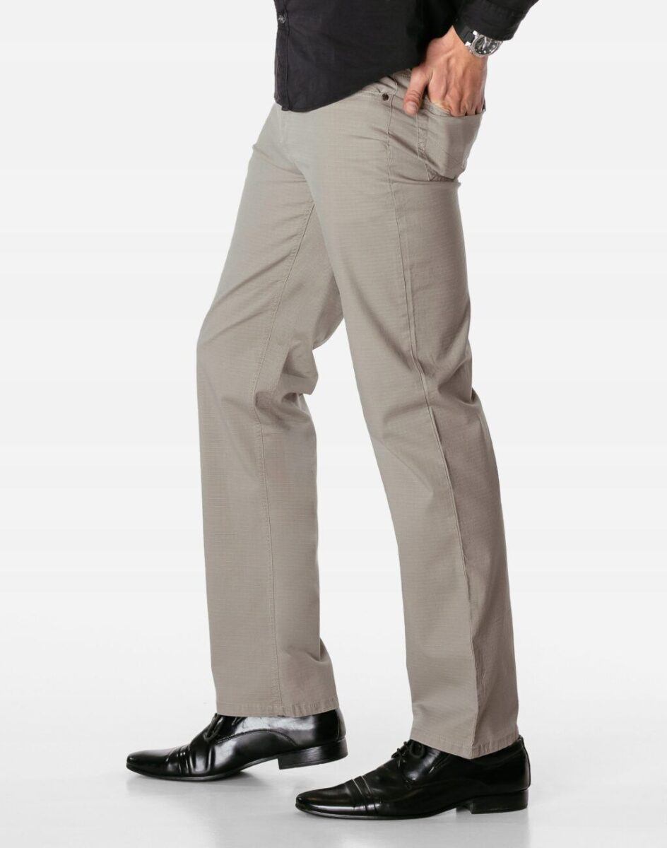 Cienkie bawełniane spodnie męskie o klasycznym kroju, to wygodne rozwiązanie na ciepłe i gorące dni wiosny i lata oraz niezbędny element wakacyjnej garderoby oraz udanych letnich stylizacji. Przewiewne i wygodne, idealne na co dzień jako element casualowego stroju, czyniąc go lekkim i dostosowanym do wysokich temperatur. Zapinane na kryty zamek błyskawiczny i metalowy guzik sygnowany logiem firmy. Z przodu mają dwie wpuszczane kieszenie na dłonie oraz mniejszą kieszonkę tzw. bilonówkę. Z tyłu dwie naszywane kieszenie jak w typowych spodniach jeansowych. W pasie szlufki umożliwiające stylizacje z paskiem. Najbardziej podatne na uszkodzenia miejsca wzmocnione są dodatkowymi przeszyciami oraz nitami.