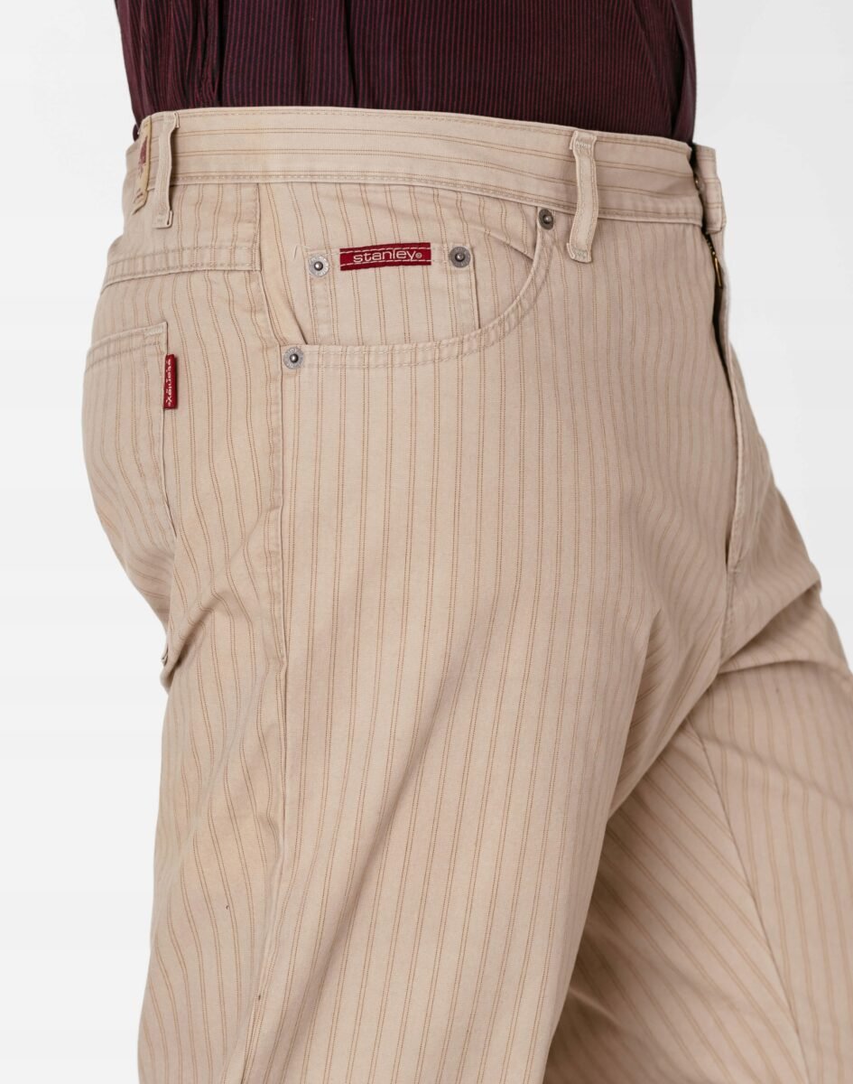 Cienkie bawełnianespodnie męskie polskiej firmy STANLEY o klasycznym kroju, to wygodne rozwiązanie na ciepłe i gorące dni wiosny i lata oraz niezbędny element wakacyjnej garderoby oraz udanych letnich stylizacji. Przewiewneiwygodne, idealne na co dzień jako element casualowego stroju, czyniąc go lekkim i dostosowanym do wysokich temperatur. Zapinane na kryty zamek błyskawiczny i metalowy guzik sygnowany logiem firmy. Z przodu mają dwie wpuszczane, ukośne kieszenie na dłonie oraz mniejszą kieszonkę tzw. bilonówkę. Z tyłu dwie naszywane kieszenie jak w typowych spodniach jeansowych. W pasie szlufki umożliwiające stylizacje z paskiem. Najbardziej podatne na uszkodzenia miejsca wzmocnione są dodatkowymi, podwójnymi przeszyciami oraz nitami.