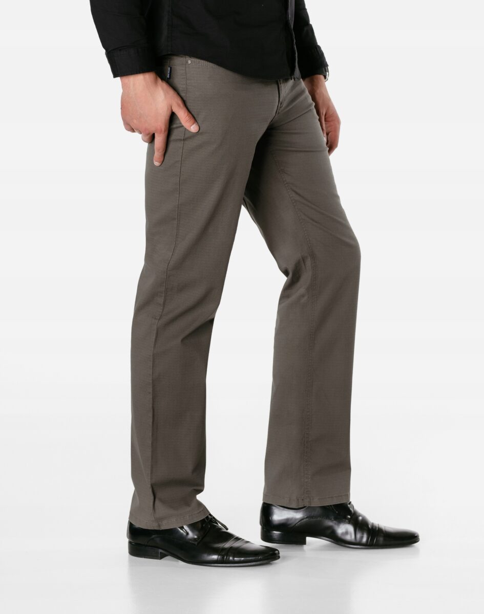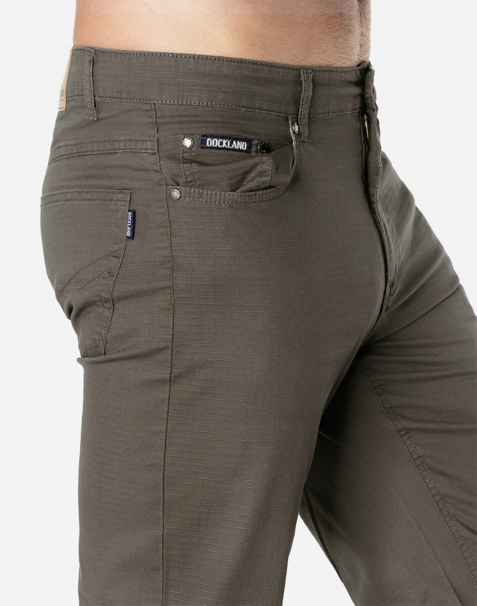Cienkie bawełniane spodnie męskie o klasycznym kroju, to wygodne rozwiązanie na ciepłe i gorące dni wiosny i lata oraz niezbędny element wakacyjnej garderoby oraz udanych letnich stylizacji. Przewiewne i wygodne, idealne na co dzień jako element casualowego stroju, czyniąc go lekkim i dostosowanym do wysokich temperatur. Zapinane na kryty zamek błyskawiczny i metalowy guzik sygnowany logiem firmy. Z przodu mają dwie wpuszczane kieszenie na dłonie oraz mniejszą kieszonkę tzw. bilonówkę. Z tyłu dwie naszywane kieszenie jak w typowych spodniach jeansowych. W pasie szlufki umożliwiające stylizacje z paskiem. Najbardziej podatne na uszkodzenia miejsca wzmocnione są dodatkowymi przeszyciami oraz nitami.