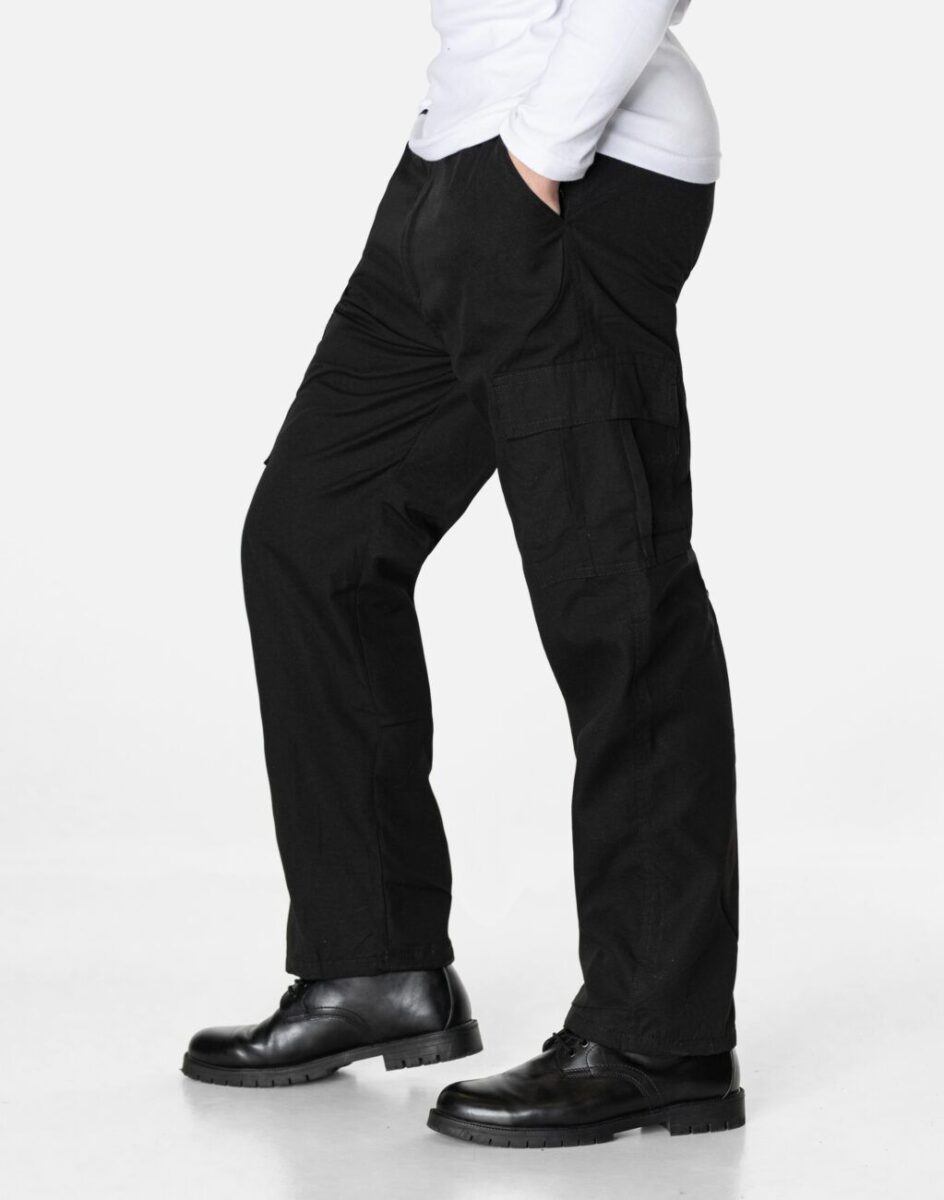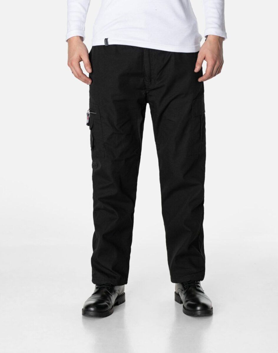 Uszyte z solidnej i mocnej tkaniny bawełnianej z niewielkim dodatkiem poliestru o gęstym zapewniającym dużą wytrzymałość splocie, co zwiększa odporność na uszkodzenia mechaniczne oraz szybkość transportu wilgoci z powierzchni ciała na zewnątrz. Z przodu mają dwie klasyczne wpuszczanie kieszenie na dłonie. Z tyłu naszywana kieszeń kryta patką zapinana na rzepa. Na udach 2 duże naszywane kieszenie transportowe typu Cargo jedna kryta patką zapinana na rzep, druga zasuwana na zamek błyskawiczny plus mała kieszonka kryta patką zapinaną na rzep. Precyzyjne dopasowanie w pasie zapewnia szeroki, elastyczny pas ściągający oraz dodatkowo wpuszczona w pasek taśma regulacyjna z możliwością jej zawiązywania. Wygodny militarny krój typu bojówki Cargo pozwala na pełną swobodę ruchów, co daje użytkownikowi wygodę przy siadaniu i zapewnia ogromny komfort noszenia. Najbardziej podatne na uszkodzenia miejsca wzmocnione są dodatkowymi podwójnymi przeszyciami.
