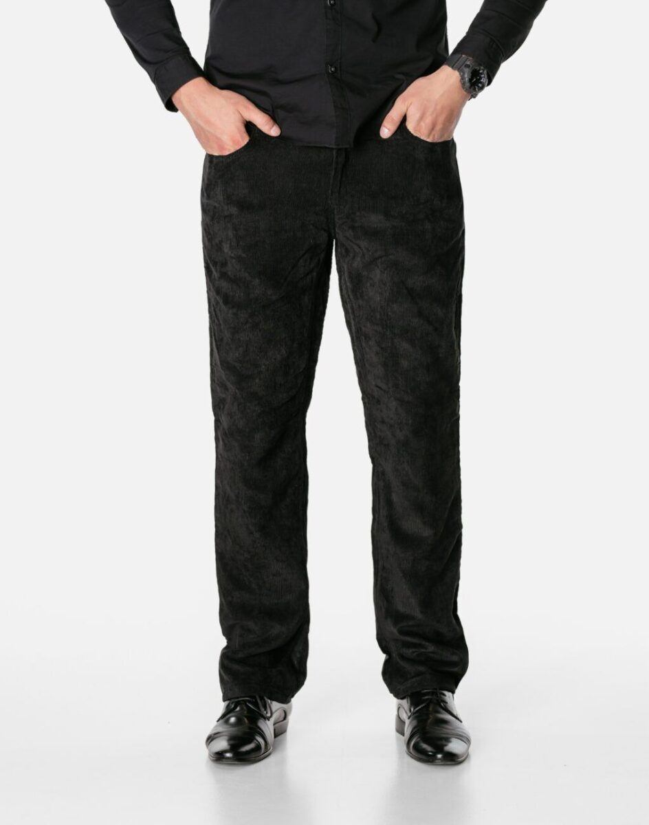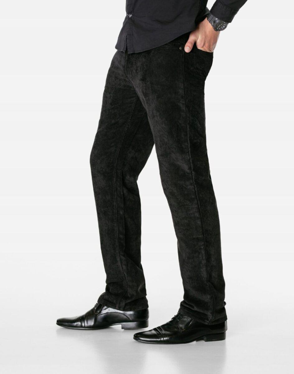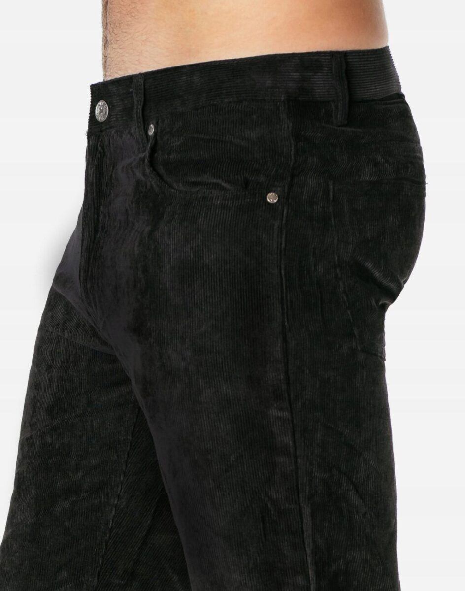 Wyjątkowo ciepłe bo ocieplone od wewnętrznej strony polarem męskie spodnie sztruksowe w kolorze czarnym na jesień, zimę, z podwyższonym stanem i klasyczną prostą nogawką Regular Fit. Wyprodukowane z ekologicznej tkaniny 100% bawełnianej w charakterystyczny drobny prążek, miękkiej i ciepłej, bardzo wygodnej w użytkowaniu. Zapinane są na kryty zamek błyskawiczny i guzik sygnowany logiem firmy. Z przodu mają dwie kieszonki zaokrąglone oraz mniejszą kieszonkę tzw. bilonówkę, a na tyle klasyczne kieszenie naszywane jak w typowych spodniach jeansowych. W pasie szlufki umożliwiające stylizacje z paskiem. Klasyczna prosta nogawka nie zaprasowana na kant. Najbardziej podatne na uszkodzenia miejsca wzmocnione są dodatkowymi przeszyciami oraz nitami.