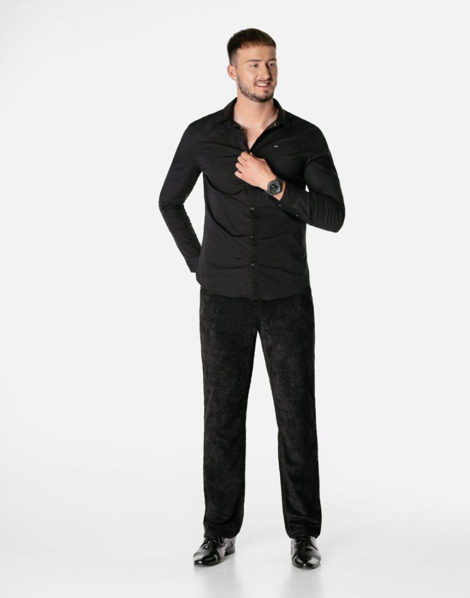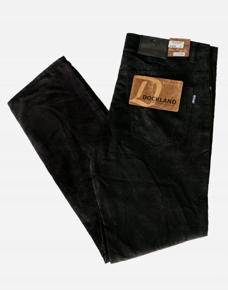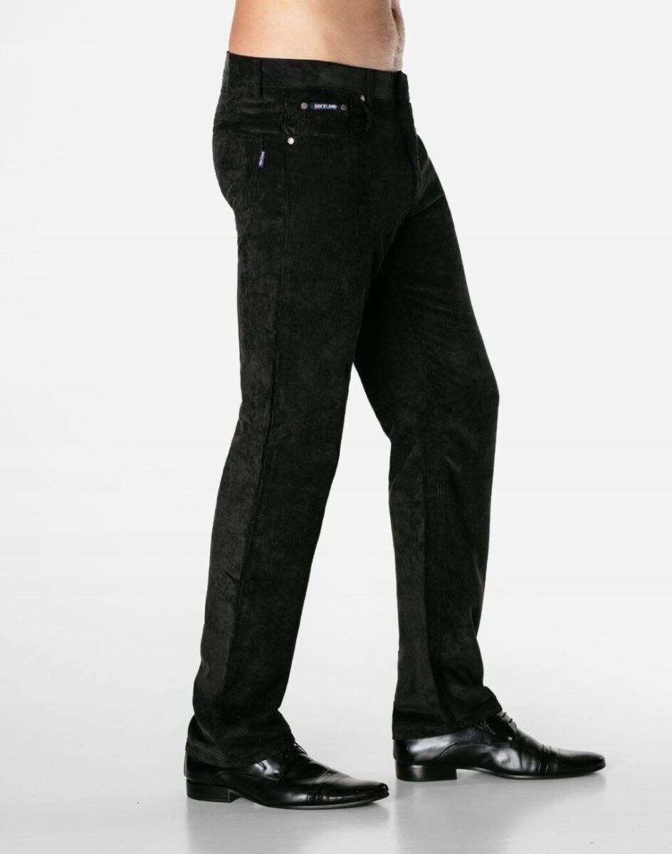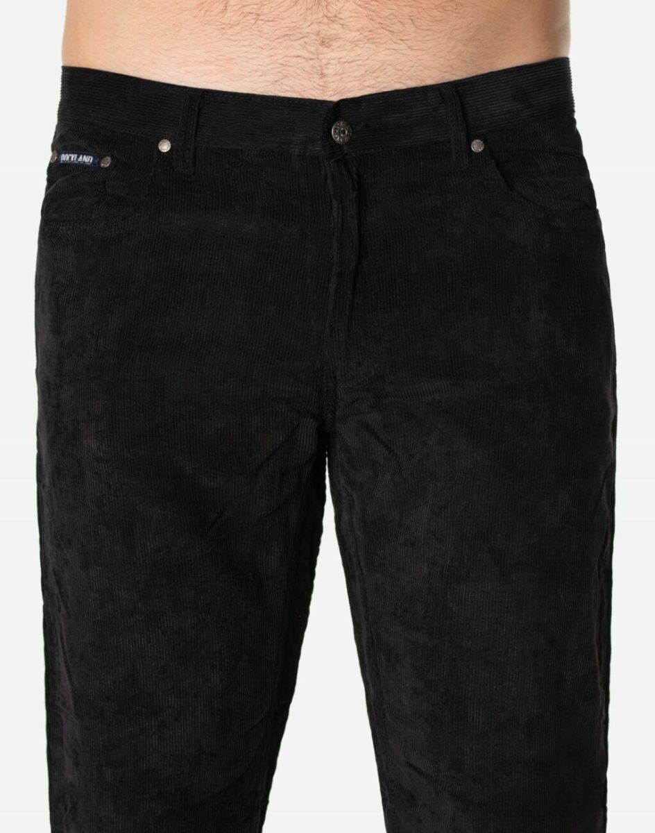 Wyjątkowo ciepłe bo ocieplone od wewnętrznej strony polarem męskie spodnie sztruksowe w kolorze czarnym na jesień, zimę, z podwyższonym stanem i klasyczną prostą nogawką Regular Fit. Wyprodukowane z ekologicznej tkaniny 100% bawełnianej w charakterystyczny drobny prążek, miękkiej i ciepłej, bardzo wygodnej w użytkowaniu. Zapinane są na kryty zamek błyskawiczny i guzik sygnowany logiem firmy. Z przodu mają dwie kieszonki zaokrąglone oraz mniejszą kieszonkę tzw. bilonówkę, a na tyle klasyczne kieszenie naszywane jak w typowych spodniach jeansowych. W pasie szlufki umożliwiające stylizacje z paskiem. Klasyczna prosta nogawka nie zaprasowana na kant. Najbardziej podatne na uszkodzenia miejsca wzmocnione są dodatkowymi przeszyciami oraz nitami.