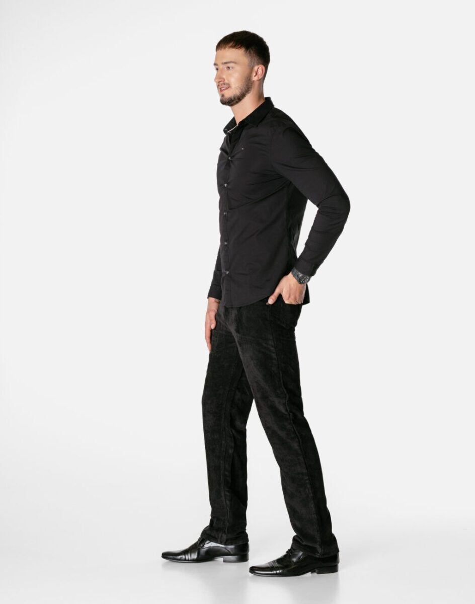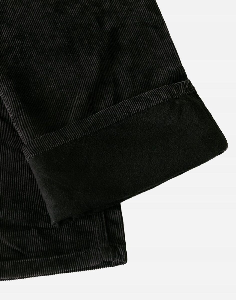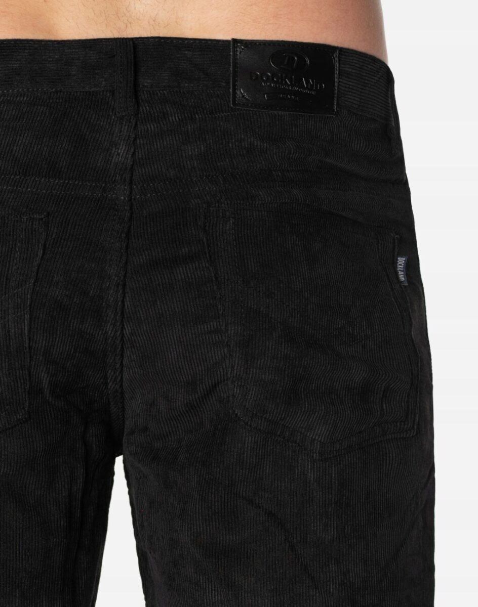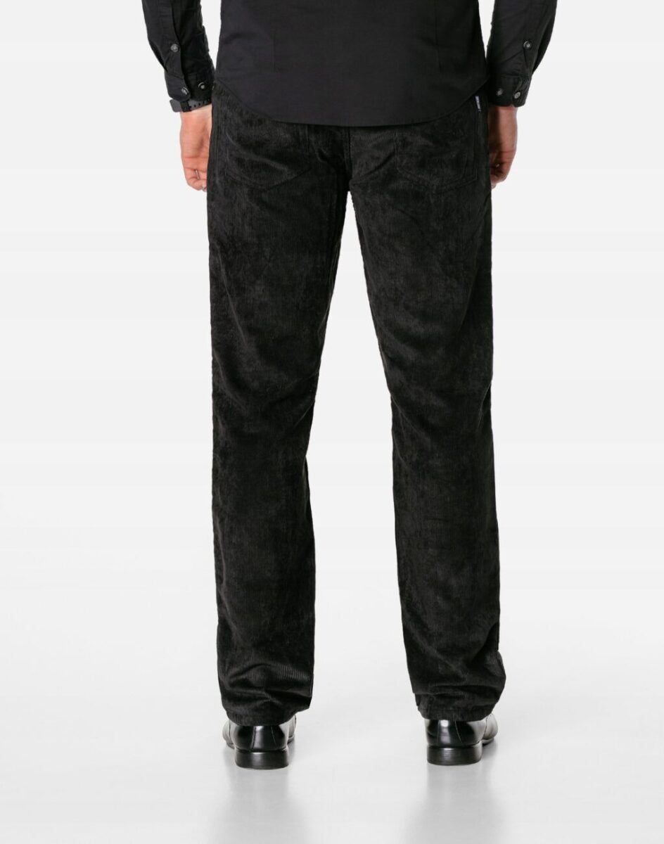 Wyjątkowo ciepłe bo ocieplone od wewnętrznej strony polarem męskie spodnie sztruksowe w kolorze czarnym na jesień, zimę, z podwyższonym stanem i klasyczną prostą nogawką Regular Fit. Wyprodukowane z ekologicznej tkaniny 100% bawełnianej w charakterystyczny drobny prążek, miękkiej i ciepłej, bardzo wygodnej w użytkowaniu. Zapinane są na kryty zamek błyskawiczny i guzik sygnowany logiem firmy. Z przodu mają dwie kieszonki zaokrąglone oraz mniejszą kieszonkę tzw. bilonówkę, a na tyle klasyczne kieszenie naszywane jak w typowych spodniach jeansowych. W pasie szlufki umożliwiające stylizacje z paskiem. Klasyczna prosta nogawka nie zaprasowana na kant. Najbardziej podatne na uszkodzenia miejsca wzmocnione są dodatkowymi przeszyciami oraz nitami.