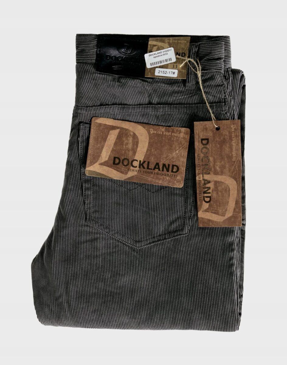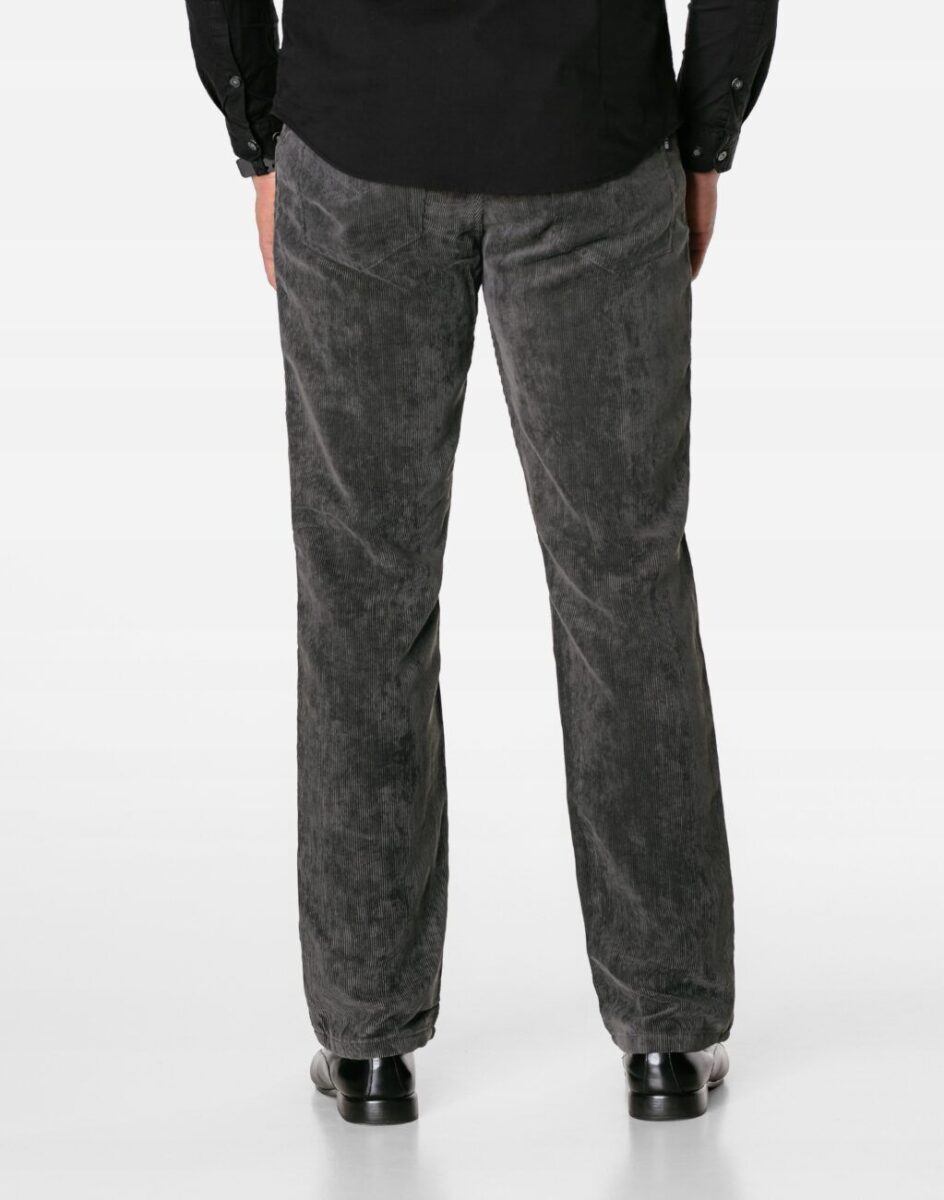 Wyjątkowo ciepłe bo ocieplone od wewnętrznej strony polarem męskie spodnie sztruksowe w kolorze stalowym na jesień, zimę, z podwyższonym stanem i klasyczną prostą nogawką Regular Fit. Wyprodukowane z ekologicznej tkaniny 100% bawełnianej w charakterystyczny drobny prążek, miękkiej i ciepłej, bardzo wygodnej w użytkowaniu. Zapinane są na kryty zamek błyskawiczny i guzik sygnowany logiem firmy. Z przodu mają dwie kieszonki zaokrąglone oraz mniejszą kieszonkę tzw. bilonówkę, a na tyle klasyczne kieszenie naszywane jak w typowych spodniach jeansowych. W pasie szlufki umożliwiające stylizacje z paskiem. Klasyczna prosta nogawka nie zaprasowana na kant. Najbardziej podatne na uszkodzenia miejsca wzmocnione są dodatkowymi przeszyciami oraz nitami.