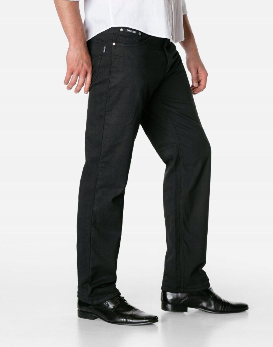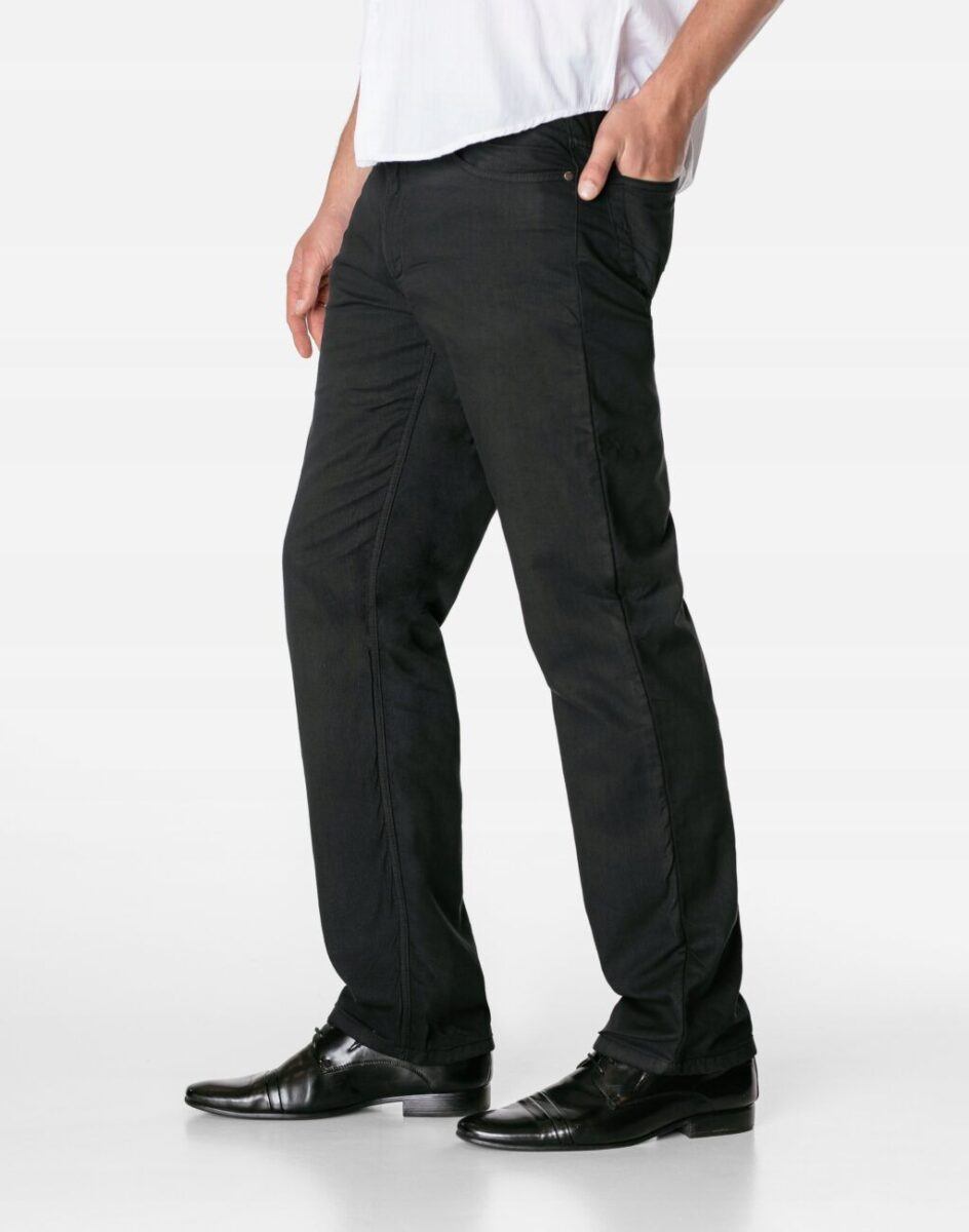 Wyjątkowo ciepłe bo ocieplone od wewnętrznej strony polarem spodnie męskiebawełniane w kolorze czarnym na jesień, zimę, z podwyższonym stanem i klasyczną prostą nogawką Regular Fit. Zapinane na kryty zamek błyskawiczny i metalowy guzik sygnowany logiem firmy. Z przodu mają dwie kieszonki zaokrąglone oraz bilonówkę, a na tyle klasyczne kieszenie naszywane jak w typowych spodniach jeansowych. W pasie szlufki umożliwiające stylizacje z paskiem. Najbardziej podatne na uszkodzenia miejsca wzmocnione są dodatkowymi przeszyciami i metalowymi nitami. Uszyte z solidnej i mocnej tkaniny bawełnianej typu Bedford wygodnej w użytkowaniu.