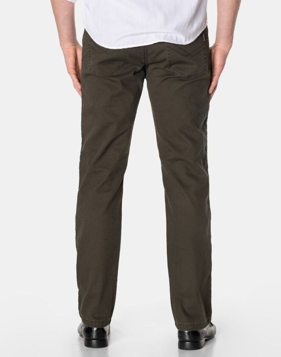 Wyjątkowo ciepłe bo ocieplone od wewnętrznej strony polarem spodnie męskie bawełniane na jesień, zimę, z podwyższonym stanem i klasyczną prostą nogawką Regular Fit. Zapinane na kryty zamek błyskawiczny i metalowy guzik sygnowany logiem firmy. Z przodu mają dwie kieszonki zaokrąglone oraz bilonówkę, a na tyle klasyczne kieszenie naszywane jak w typowych spodniach jeansowych. W pasie szlufki umożliwiające stylizacje z paskiem. Najbardziej podatne na uszkodzenia miejsca wzmocnione są dodatkowymi przeszyciami i metalowymi nitami. Uszyte z solidnej i mocnej tkaniny bawełnianej typu Bedford w drobny prążek przypominający sztruks, wyjątkowo wygodnej w użytkowaniu.
