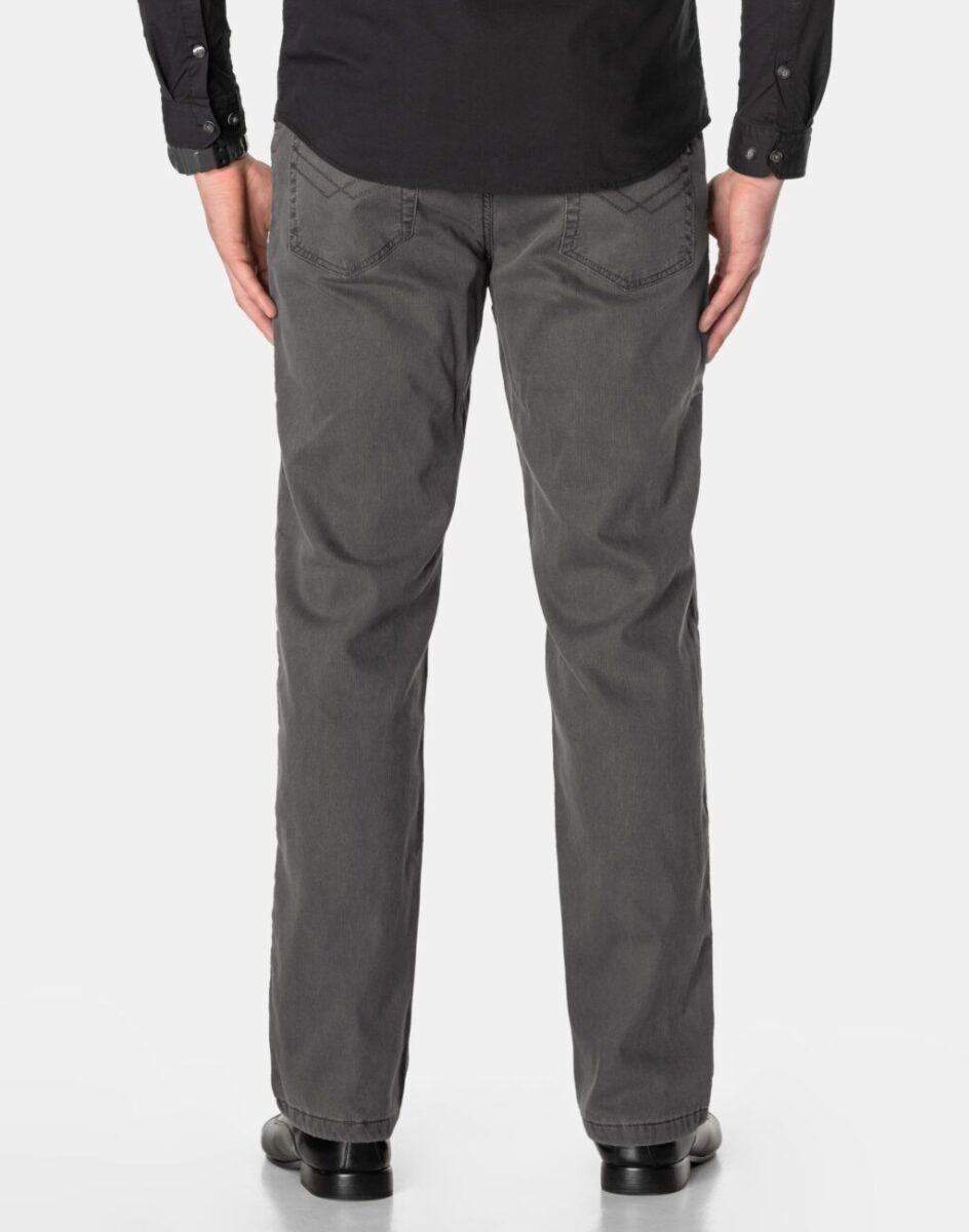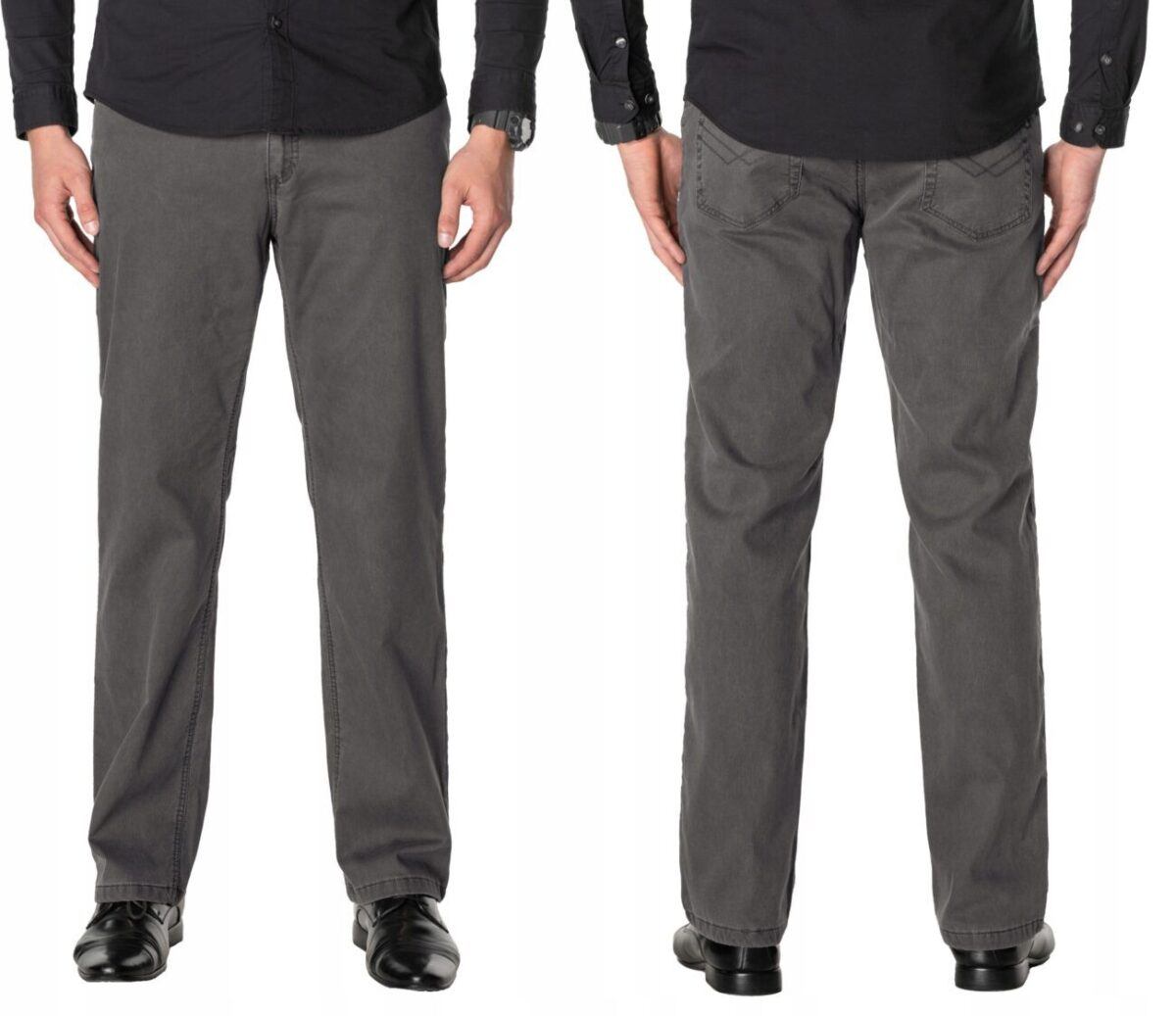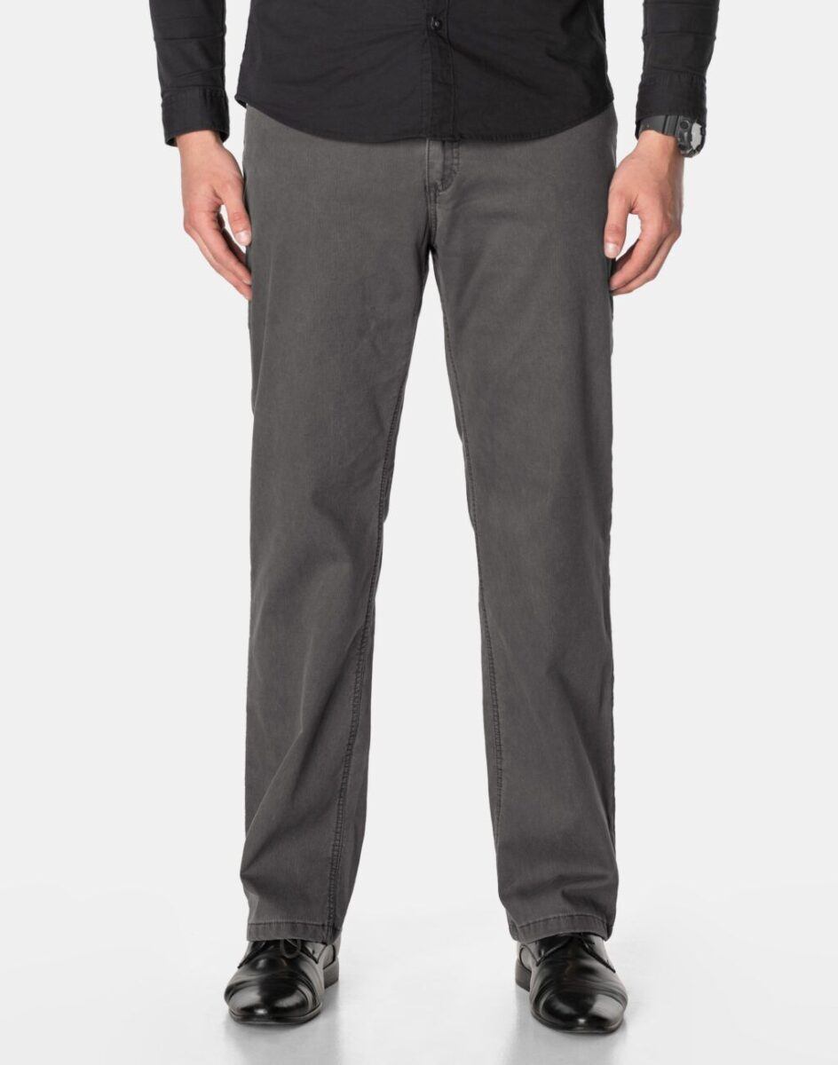 Wyjątkowo ciepłe bo ocieplone od wewnętrznej strony polarem spodnie męskie bawełniane w kolorze stalowym na jesień, zimę, z podwyższonym stanem i klasyczną prostą nogawką Regular Fit. Zapinane na kryty zamek błyskawiczny i metalowy guzik sygnowany logiem firmy. Z przodu mają dwie kieszonki zaokrąglone oraz bilonówkę, a na tyle klasyczne kieszenie naszywane jak w typowych spodniach jeansowych. W pasie szlufki umożliwiające stylizacje z paskiem. Najbardziej podatne na uszkodzenia miejsca wzmocnione są dodatkowymi przeszyciami i metalowymi nitami. Uszyte z solidnej i mocnej tkaniny bawełnianej typu Bedford w drobny prążek przypominający sztruks, wygodnej w użytkowaniu.