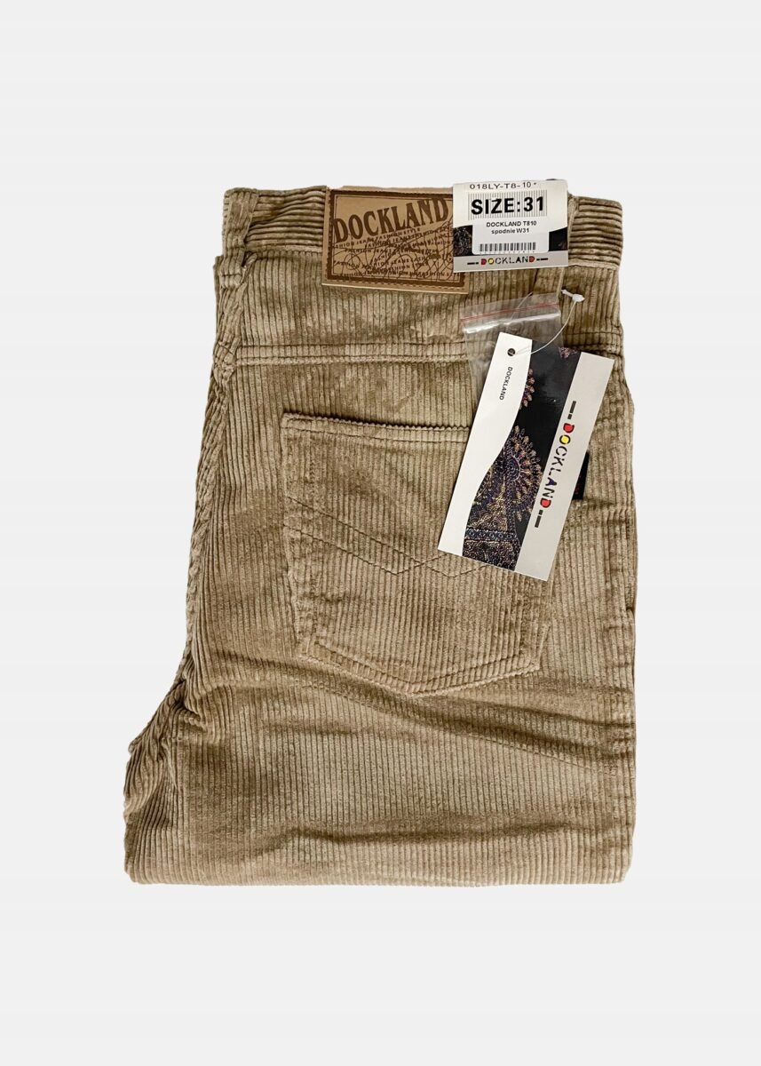 Wyprodukowane z ekologicznej tkaniny 100% bawełnianej w charakterystyczny gruby prążek, miękkiej i ciepłej, bardzo wygodnej w użytkowaniu. Delikatnie elastyczny materiał pozwala na pełną swobodę ruchów, co daje komfort przy siadaniu i zapewniają ogromny komfort noszenia. Zapinane są na kryty zamek błyskawiczny i metalowy guzik sygnowany logiem firmy. Z przodu mają dwie kieszonki zaokrąglone oraz mniejszą kieszonkę tzw. bilonówkę, a na tyle klasyczne kieszenie naszywane jak w typowych spodniach jeansowych. W pasie szlufki umożliwiające stylizacje z paskiem. Klasyczna prosta nogawka nie zaprasowana na kant. Najbardziej podatne na uszkodzenia miejsca wzmocnione są dodatkowymi przeszyciami oraz nitami. Prosty, klasyczny fason spodni Regular Fit o bardzo dobrym i sprawdzonym przez wielu zadowolonych klientów kroju.