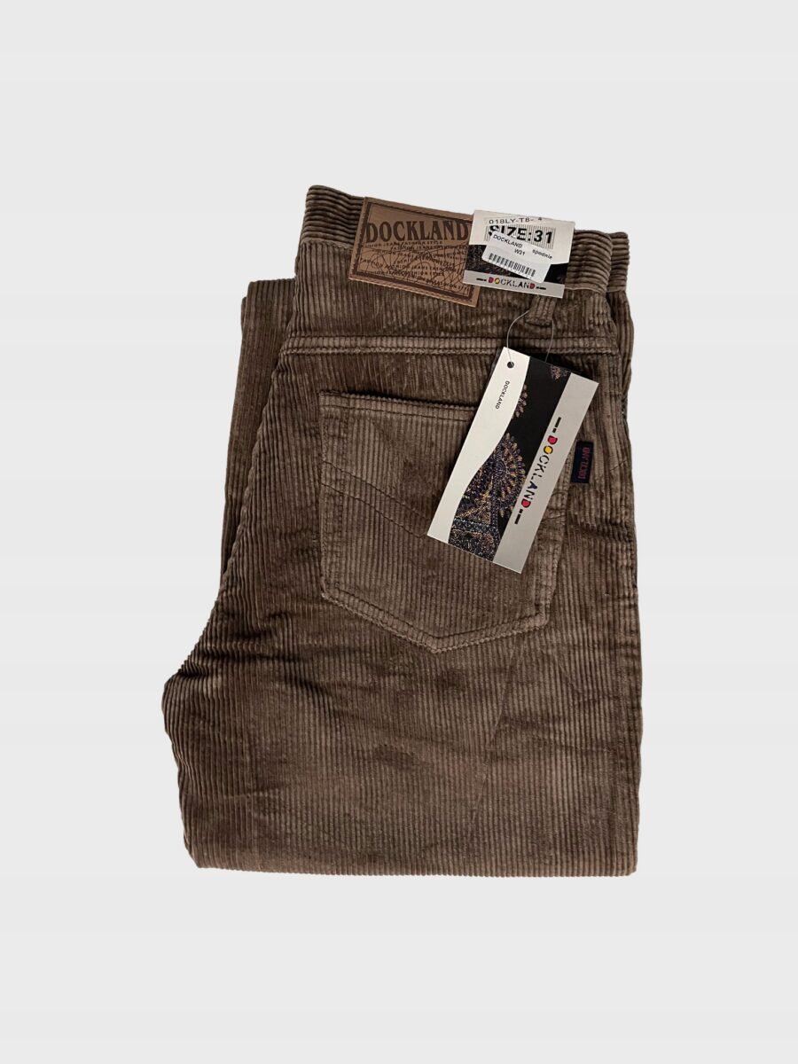 Wyprodukowane z ekologicznej tkaniny 100% bawełnianej w charakterystyczny gruby prążek, miękkiej i ciepłej, bardzo wygodnej w użytkowaniu. Delikatnie elastyczny materiał pozwala na pełną swobodę ruchów, co daje komfort przy siadaniu i zapewniają ogromny komfort noszenia. Zapinane są na kryty zamek błyskawiczny i metalowy guzik sygnowany logiem firmy. Z przodu mają dwie kieszonki zaokrąglone oraz mniejszą kieszonkę tzw. bilonówkę, a na tyle klasyczne kieszenie naszywane jak w typowych spodniach jeansowych. W pasie szlufki umożliwiające stylizacje z paskiem. Klasyczna prosta nogawka nie zaprasowana na kant. Najbardziej podatne na uszkodzenia miejsca wzmocnione są dodatkowymi przeszyciami oraz nitami. Prosty, klasyczny fason spodni Regular Fit o bardzo dobrym i sprawdzonym przez wielu zadowolonych klientów kroju.