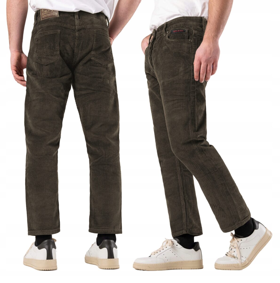 Wyprodukowane z ekologicznej tkaniny 100% bawełnianej w charakterystyczny gruby prążek, miękkiej i ciepłej, bardzo wygodnej w użytkowaniu. Delikatnie elastyczny materiał pozwala na pełną swobodę ruchów, co daje komfort przy siadaniu i zapewniają ogromny komfort noszenia. Zapinane są na kryty zamek błyskawiczny i metalowy guzik sygnowany logiem firmy. Z przodu mają dwie kieszonki zaokrąglone oraz mniejszą kieszonkę tzw. bilonówkę, a na tyle klasyczne kieszenie naszywane jak w typowych spodniach jeansowych. W pasie szlufki umożliwiające stylizacje z paskiem. Klasyczna prosta nogawka nie zaprasowana na kant. Najbardziej podatne na uszkodzenia miejsca wzmocnione są dodatkowymi przeszyciami oraz nitami. Prosty, klasyczny fason spodni Regular Fit o bardzo dobrym i sprawdzonym przez wielu zadowolonych klientów kroju.