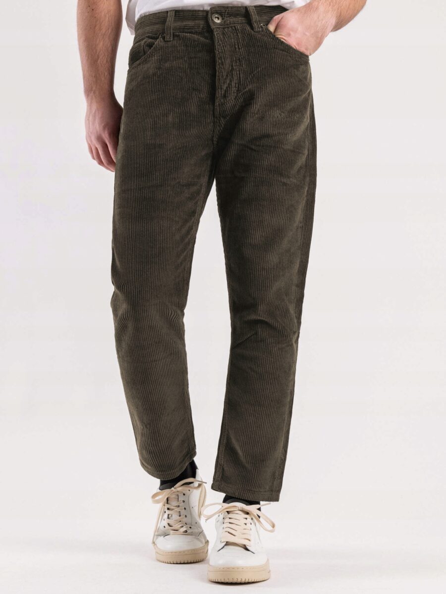 Wyprodukowane z ekologicznej tkaniny 100% bawełnianej w charakterystyczny gruby prążek, miękkiej i ciepłej, bardzo wygodnej w użytkowaniu. Delikatnie elastyczny materiał pozwala na pełną swobodę ruchów, co daje komfort przy siadaniu i zapewniają ogromny komfort noszenia. Zapinane są na kryty zamek błyskawiczny i metalowy guzik sygnowany logiem firmy. Z przodu mają dwie kieszonki zaokrąglone oraz mniejszą kieszonkę tzw. bilonówkę, a na tyle klasyczne kieszenie naszywane jak w typowych spodniach jeansowych. W pasie szlufki umożliwiające stylizacje z paskiem. Klasyczna prosta nogawka nie zaprasowana na kant. Najbardziej podatne na uszkodzenia miejsca wzmocnione są dodatkowymi przeszyciami oraz nitami. Prosty, klasyczny fason spodni Regular Fit o bardzo dobrym i sprawdzonym przez wielu zadowolonych klientów kroju.