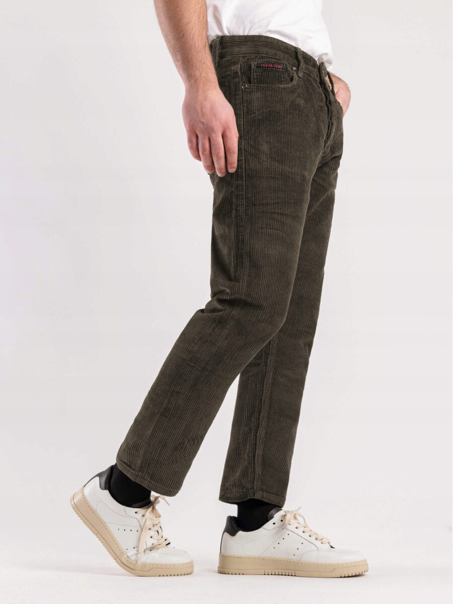 Wyprodukowane z ekologicznej tkaniny 100% bawełnianej w charakterystyczny gruby prążek, miękkiej i ciepłej, bardzo wygodnej w użytkowaniu. Delikatnie elastyczny materiał pozwala na pełną swobodę ruchów, co daje komfort przy siadaniu i zapewniają ogromny komfort noszenia. Zapinane są na kryty zamek błyskawiczny i metalowy guzik sygnowany logiem firmy. Z przodu mają dwie kieszonki zaokrąglone oraz mniejszą kieszonkę tzw. bilonówkę, a na tyle klasyczne kieszenie naszywane jak w typowych spodniach jeansowych. W pasie szlufki umożliwiające stylizacje z paskiem. Klasyczna prosta nogawka nie zaprasowana na kant. Najbardziej podatne na uszkodzenia miejsca wzmocnione są dodatkowymi przeszyciami oraz nitami. Prosty, klasyczny fason spodni Regular Fit o bardzo dobrym i sprawdzonym przez wielu zadowolonych klientów kroju.