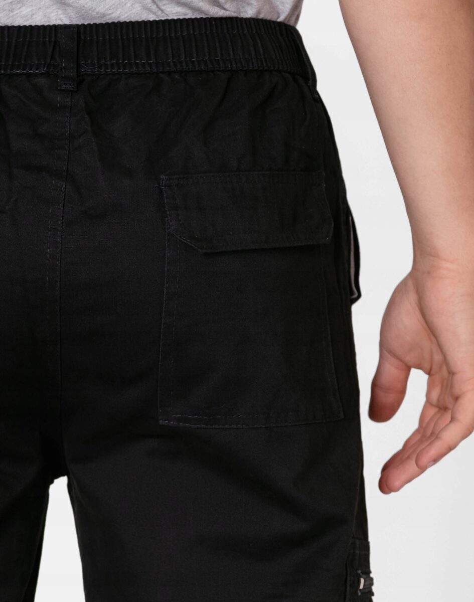 Z przodu dwie klasyczne wpuszczane kieszenie na dłonie. Z tyłu dwie kieszenie naszywane kryte patką zapinaną na rzep. Na prawym udzie dwie kieszenie, większa zasuwana na zamek, mniejsza kryta patką zapinaną na rzep. Na lewym udzie duża kieszeń typu Cargo również kryta patką zapinaną na rzep. Dopasowanie w pasie zapewnia szeroki, elastyczny pas ściągający oraz dodatkowo wpuszczona w pasek taśma regulacyjna z możliwością jej zawiązywania a także szlufki umożliwiające stylizacje z paskiem. Najbardziej podatne na uszkodzenia miejsca wzmocnione są podwójnymi przeszyciami. Luźny militarny krój typu bojówki pozwala na pełną swobodę ruchów co daje użytkownikowi wygodę przy siadaniu i zapewnia ogromny komfort noszenia.