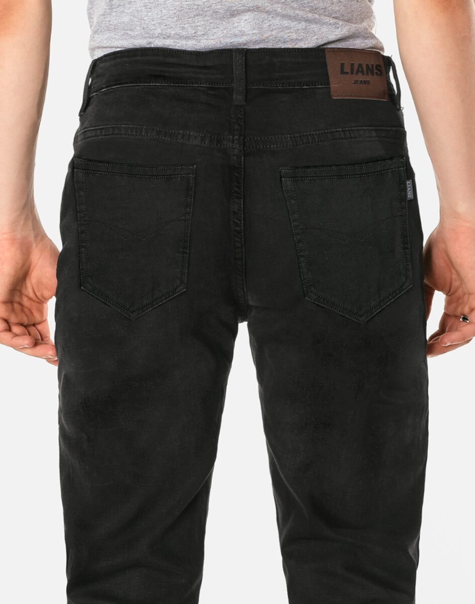 Czarne spodnie jeansowe ze standardowym stanem i klasyczną prostą nogawką to jeden z najczęściej wybieranych przez mężczyzn modeli spodni. Niesłychanie wygodne i praktyczne podczas użytkowania, wykonane z wysokiej jakości solidnej, trwałej i mocnej tkaniny bawełnianej typu Black Denim Jeans o jednolitym czarnym wybarwieniu z dodatkiem lycry wyjątkowo wygodnej w użytkowaniu. Niewielki dodatek lycry sprawia że spodnie są bardziej elastyczne, dobrze dopasowują się do sylwetki, i są bardzo komfortowe w użytkowaniu. Łatwo się je zakłada i są znacznie wygodniejsze od jeansów, które lycry nie mają. Poza tym bawełna ma tendencję do kurczenia się w praniu, dlatego lycra sprawia, że spodnie są wyjątkowo praktyczne i można je bez problemu założyć zaraz po wysuszeniu. Pozwalają na pełną swobodę ruchów, co daje wygodę przy siadaniu i zapewnia ogromny komfort noszenia. Zapinane na kryty zamek błyskawiczny i metalowy guzik sygnowany logiem firmy. Z przodu mają dwie zaokrąglone kieszonki oraz jedną mniejszą tzw. bilonówkę, a na tyle klasyczne naszywane kieszenie jak w typowych spodniach jeansowych. Najbardziej podatne na uszkodzenia miejsca wzmocnione są dodatkowymi przeszyciami oraz metalowymi nitami. W pasie szlufki umożliwiające stylizacje z paskiem.