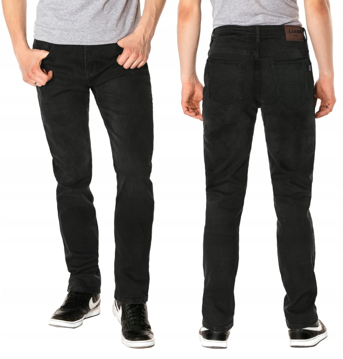 Czarne spodnie jeansowe ze standardowym stanem i klasyczną prostą nogawką to jeden z najczęściej wybieranych przez mężczyzn modeli spodni. Niesłychanie wygodne i praktyczne podczas użytkowania, wykonane z wysokiej jakości solidnej, trwałej i mocnej tkaniny bawełnianej typu Black Denim Jeans o jednolitym czarnym wybarwieniu z dodatkiem lycry wyjątkowo wygodnej w użytkowaniu. Niewielki dodatek lycry sprawia że spodnie są bardziej elastyczne, dobrze dopasowują się do sylwetki, i są bardzo komfortowe w użytkowaniu. Łatwo się je zakłada i są znacznie wygodniejsze od jeansów, które lycry nie mają. Poza tym bawełna ma tendencję do kurczenia się w praniu, dlatego lycra sprawia, że spodnie są wyjątkowo praktyczne i można je bez problemu założyć zaraz po wysuszeniu. Pozwalają na pełną swobodę ruchów, co daje wygodę przy siadaniu i zapewnia ogromny komfort noszenia. Zapinane na kryty zamek błyskawiczny i metalowy guzik sygnowany logiem firmy. Z przodu mają dwie zaokrąglone kieszonki oraz jedną mniejszą tzw. bilonówkę, a na tyle klasyczne naszywane kieszenie jak w typowych spodniach jeansowych. Najbardziej podatne na uszkodzenia miejsca wzmocnione są dodatkowymi przeszyciami oraz metalowymi nitami. W pasie szlufki umożliwiające stylizacje z paskiem.