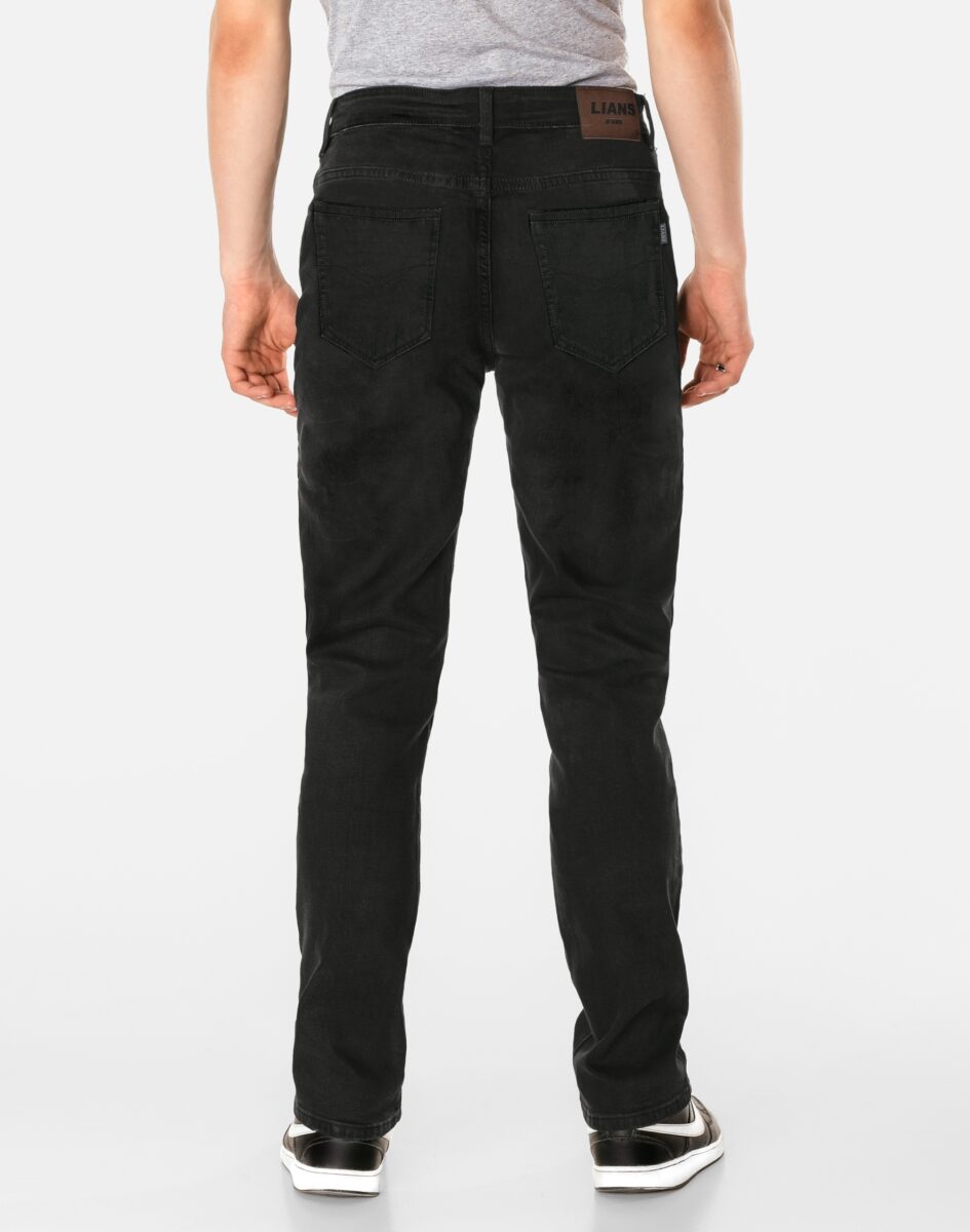 Czarne spodnie jeansowe ze standardowym stanem i klasyczną prostą nogawką to jeden z najczęściej wybieranych przez mężczyzn modeli spodni. Niesłychanie wygodne i praktyczne podczas użytkowania, wykonane z wysokiej jakości solidnej, trwałej i mocnej tkaniny bawełnianej typu Black Denim Jeans o jednolitym czarnym wybarwieniu z dodatkiem lycry wyjątkowo wygodnej w użytkowaniu. Niewielki dodatek lycry sprawia że spodnie są bardziej elastyczne, dobrze dopasowują się do sylwetki, i są bardzo komfortowe w użytkowaniu. Łatwo się je zakłada i są znacznie wygodniejsze od jeansów, które lycry nie mają. Poza tym bawełna ma tendencję do kurczenia się w praniu, dlatego lycra sprawia, że spodnie są wyjątkowo praktyczne i można je bez problemu założyć zaraz po wysuszeniu. Pozwalają na pełną swobodę ruchów, co daje wygodę przy siadaniu i zapewnia ogromny komfort noszenia. Zapinane na kryty zamek błyskawiczny i metalowy guzik sygnowany logiem firmy. Z przodu mają dwie zaokrąglone kieszonki oraz jedną mniejszą tzw. bilonówkę, a na tyle klasyczne naszywane kieszenie jak w typowych spodniach jeansowych. Najbardziej podatne na uszkodzenia miejsca wzmocnione są dodatkowymi przeszyciami oraz metalowymi nitami. W pasie szlufki umożliwiające stylizacje z paskiem.