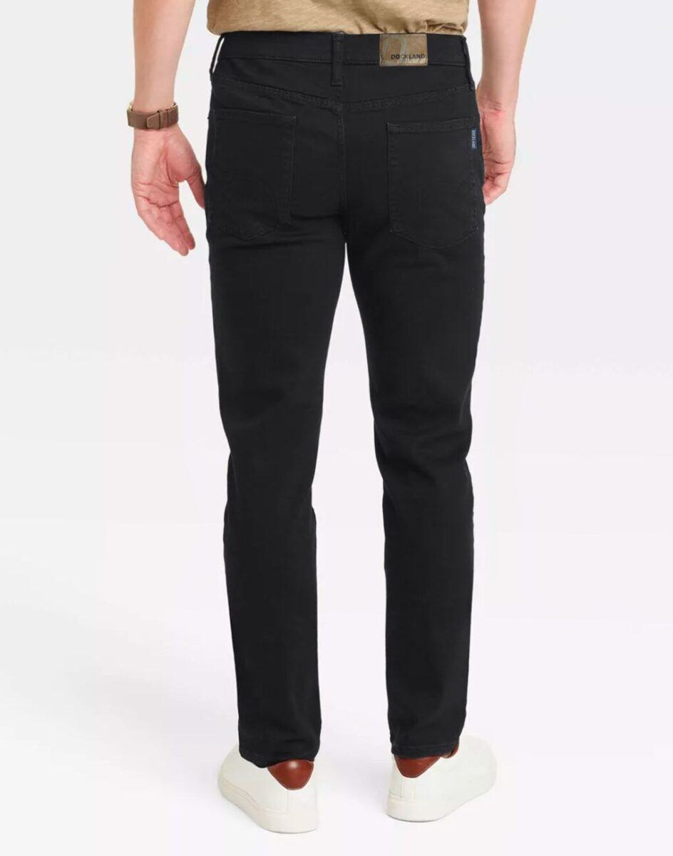 Klasyczne i ponadczasowe spodnie męskie bawełniane model 21568#, umiarkowanie swobodne w biodrach, o prostych, smukłych nogawkach to jeden z najczęściej wybieranych przez mężczyzn modeli spodni. Wykonane z wysokiej jakości trwałej i mocnej tkaniny 100% bawełnianej o jednolitym czarnym wybarwieniu, wyjątkowo wygodnej w użytkowaniu. Zapinane na kryty zamek błyskawiczny i metalowy guzik sygnowany logiem firmy. Z przodu mają dwie zaokrąglone kieszonki oraz jedną mniejszą tzw. bilonówkę, a na tyle klasyczne naszywane kieszenie jak w typowych spodniach jeansowych. Najbardziej podatne na uszkodzenia miejsca wzmocnione są podwójnymi przeszyciami oraz metalowymi nitami. W pasie szlufki umożliwiające stylizacje z paskiem.
