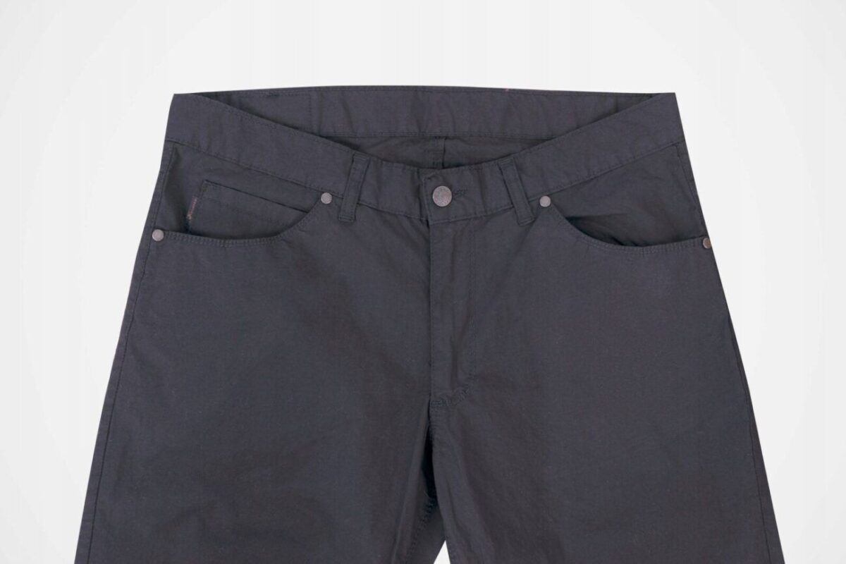 - Kieszenie: dwie wpuszczane kieszenie z przodu oraz bilonówka, dwie naszywane kieszenie z tyłu