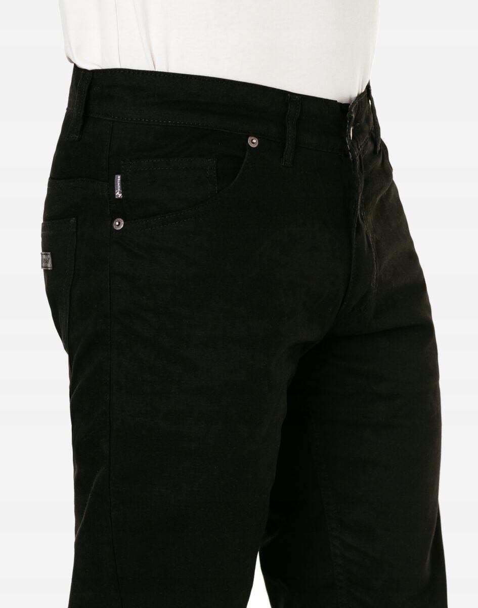 Niesłychanie wygodne i praktyczne podczas użytkowania spodnie męskie bawełniane polskiej firmy HUNTER ze standardowym stanem i klasyczną lekko zwężaną nogawką to jeden z najczęściej wybieranych modeli spodni. Wykonane z wysokiej jakości trwałej i mocnej tkaniny bawełnianej o gęstym, drobnym splocie i jednolitym czarnym wybarwieniu, wyjątkowo wygodnej w użytkowaniu. Zapinane na kryty zamek błyskawiczny i metalowy guzik sygnowany logiem firmy. Z przodu mają dwie zaokrąglone kieszonki oraz jedną mniejszą tzw. bilonówkę, a na tyle klasyczne naszywane kieszenie jak w typowych spodniach jeansowych. Najbardziej podatne na uszkodzenia miejsca wzmocnione są podwójnymi przeszyciami oraz metalowymi nitami. W pasie szlufki umożliwiające eleganckie stylizacje z paskiem.