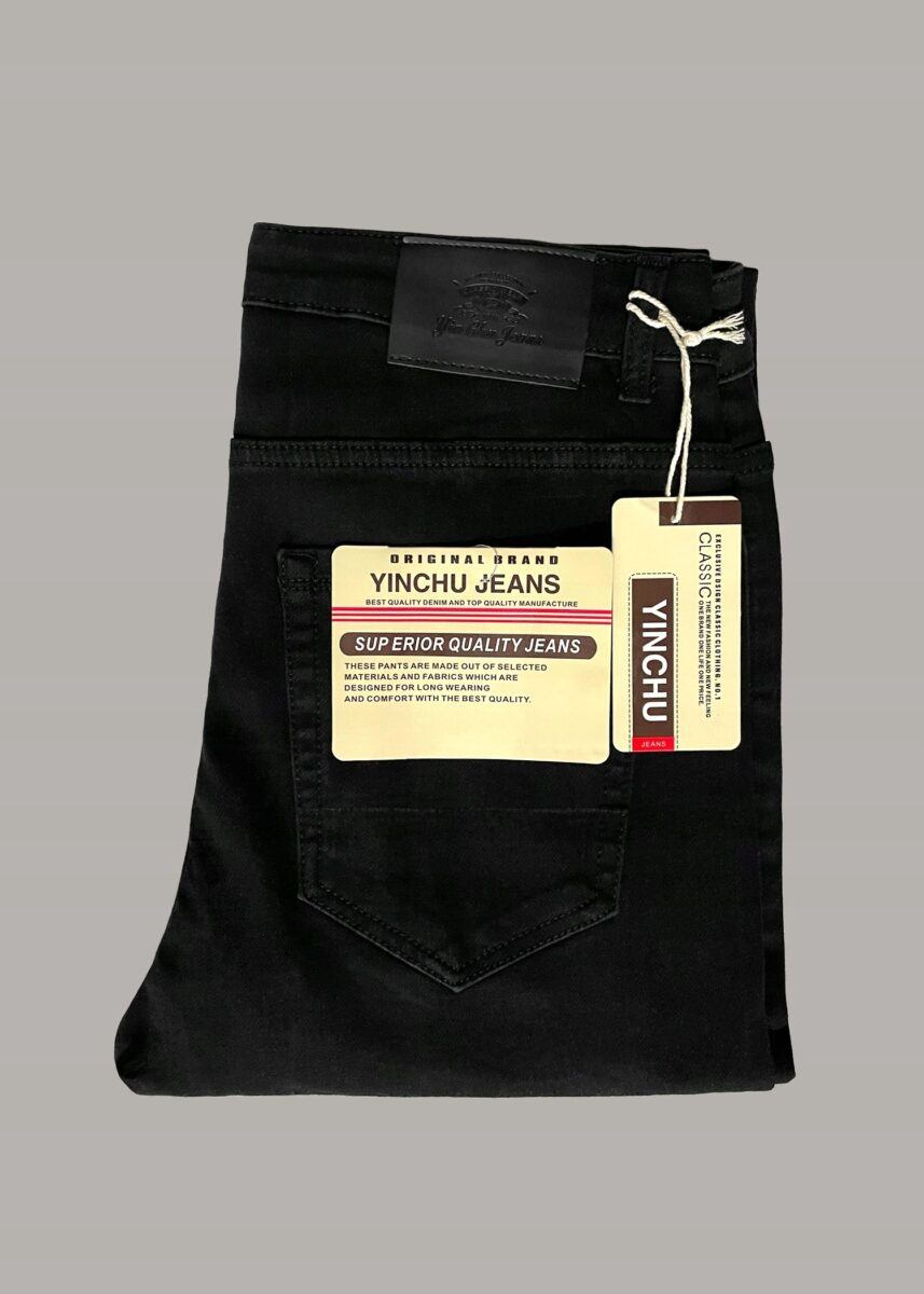 Klasyczne i ponadczasowe spodnie męskie jeansowe model 9768#, umiarkowanie swobodne w biodrach, o lekko zwężanych nogawkach to jeden z najczęściej wybieranych przez mężczyzn modeli spodni. Wykonane z wysokiej jakości gęstej, trwałej i mocnej tkaniny bawełnianej typu Black Denim Jeans o jednolitym czarnym wybarwieniu, wyjątkowo wygodnej w użytkowaniu. Niewielki dodatek spandexu (lycra) sprawia, że spodnie są bardziej elastyczne, dobrze dopasowują się do sylwetki, i są bardzo komfortowe w użytkowaniu. Łatwo się je zakłada i są znacznie wygodniejsze od jeansów, które lycry nie mają. Poza tym bawełna ma tendencję do kurczenia się w praniu, dlatego lycra sprawia, że spodnie są wyjątkowo praktyczne i można je bez problemu założyć po wysuszeniu. Pozwalają na pełną swobodę ruchów, co daje wygodę przy siadaniu i zapewnia ogromny komfort noszenia. Zapinane na kryty zamek błyskawiczny i metalowy guzik. Z przodu mają dwie zaokrąglone kieszonki oraz jedną mniejszą tzw. bilonówkę, a na tyle klasyczne kieszenie naszywane. Najbardziej podatne na uszkodzenia miejsca wzmocnione są podwójnymi przeszyciami oraz metalowymi nitami. W pasie szlufki umożliwiające stylizacje z paskiem.