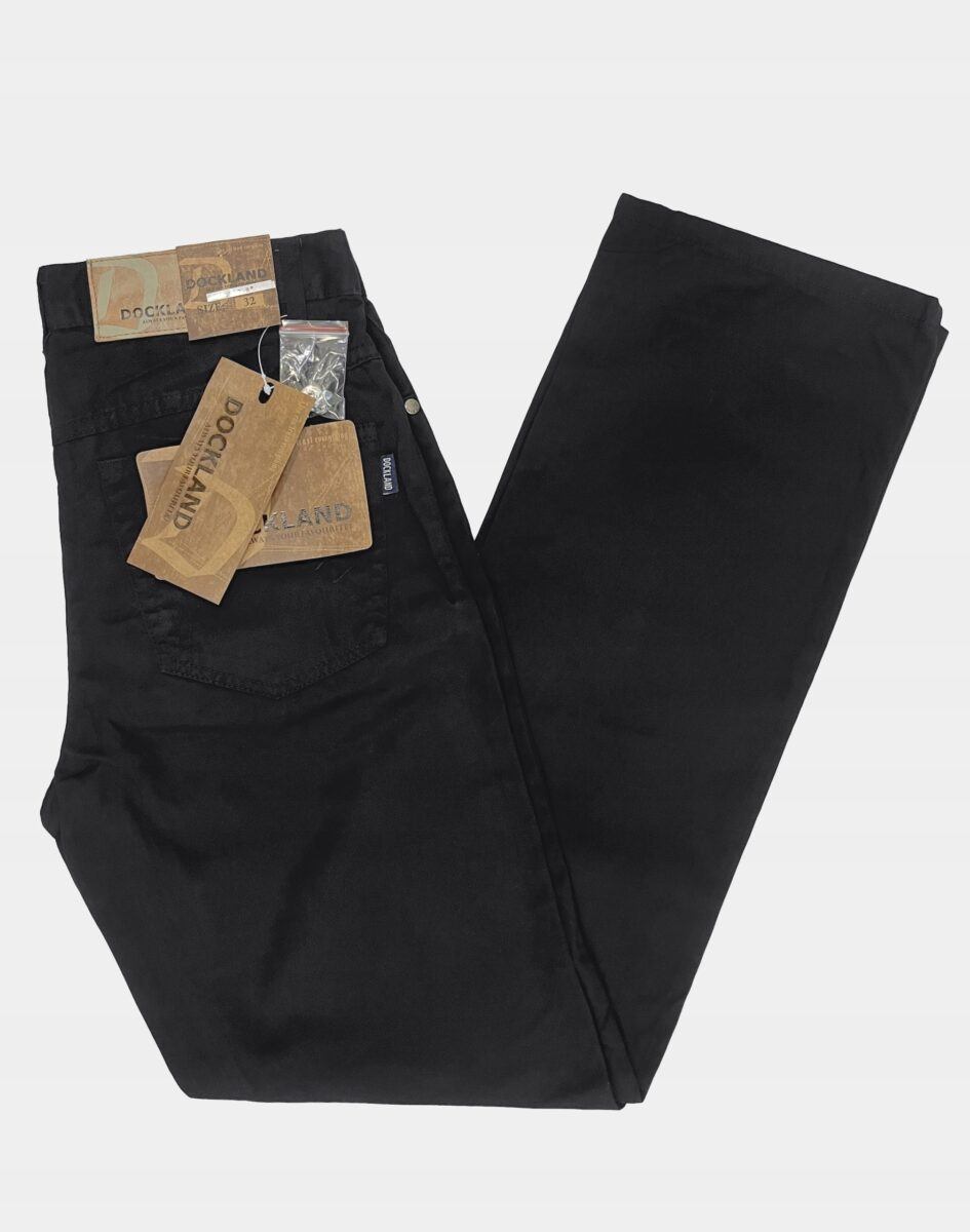 Klasyczne i ponadczasowe spodnie męskie bawełniane model 21568#, umiarkowanie swobodne w biodrach, o prostych, smukłych nogawkach to jeden z najczęściej wybieranych przez mężczyzn modeli spodni. Wykonane z wysokiej jakości trwałej i mocnej tkaniny 100% bawełnianej o jednolitym czarnym wybarwieniu, wyjątkowo wygodnej w użytkowaniu. Zapinane na kryty zamek błyskawiczny i metalowy guzik sygnowany logiem firmy. Z przodu mają dwie zaokrąglone kieszonki oraz jedną mniejszą tzw. bilonówkę, a na tyle klasyczne naszywane kieszenie jak w typowych spodniach jeansowych. Najbardziej podatne na uszkodzenia miejsca wzmocnione są podwójnymi przeszyciami oraz metalowymi nitami. W pasie szlufki umożliwiające stylizacje z paskiem.