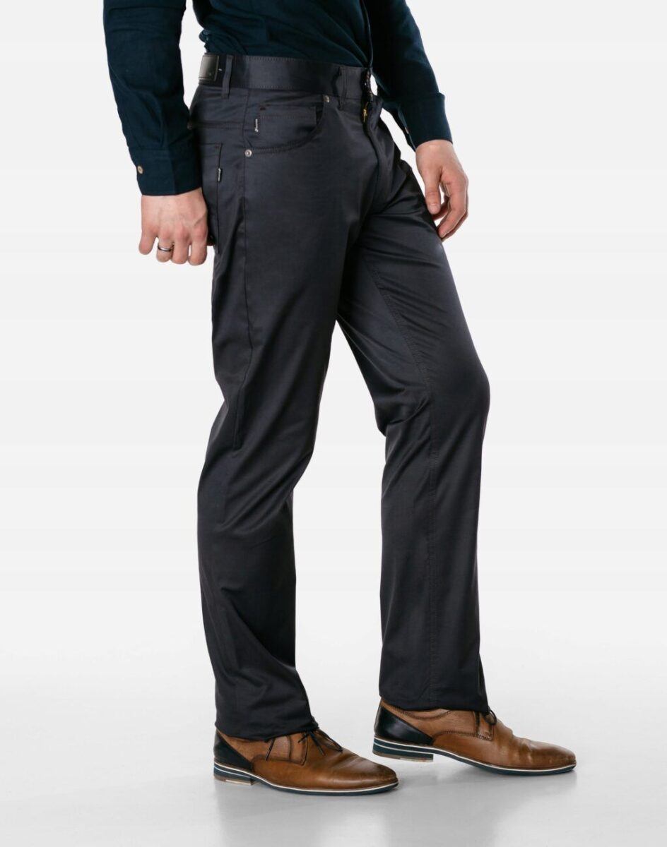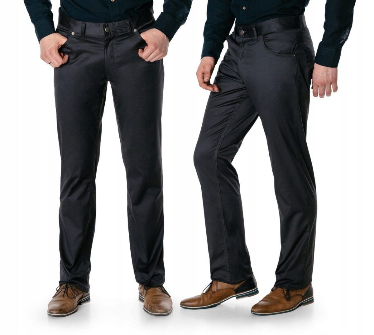 Fason typu REGULAR FIT czyli model z klasycznymi, lekko zwężanymi nogawkami i standardowym stanem, stylowy i równocześnie wygodny, wyraźnie wysmuklający męską sylwetkę. Użyta do produkcji spodni wysokiej jakości tkanina bawełniana dzięki niewielkiemu dodatkowi lycry (elastan) jest delikatnie elastyczna co sprawia że spodnie są wyjątkowo wygodne w użytkowaniu, pozwalają na pełną swobodę ruchów co daje wygodę przy siadaniu i zapewnia ogromny komfort noszenia. Idealne nie tylko na co dzień lecz również jako element stroju do pracy. Doskonale wpisują się w światowe modowe trendy i są przy tym wygodne i trwałe. W zależności od dopasowanego do nich elementu garderoby będziesz zawsze odpowiednio ubrany na każdą okazję, zarówno na „sportowo” jak i na „elegancko” bo ta sama para spodni z marynarką czy koszulą tworzy styl bardziej formalny, natomiast z T-shirtem doskonale nadaje się na weekendowe spotkania. Idealny wybór dla mężczyzn ceniących nowoczesne rozwiązania, sportowy styl i nienaganną elegancję.