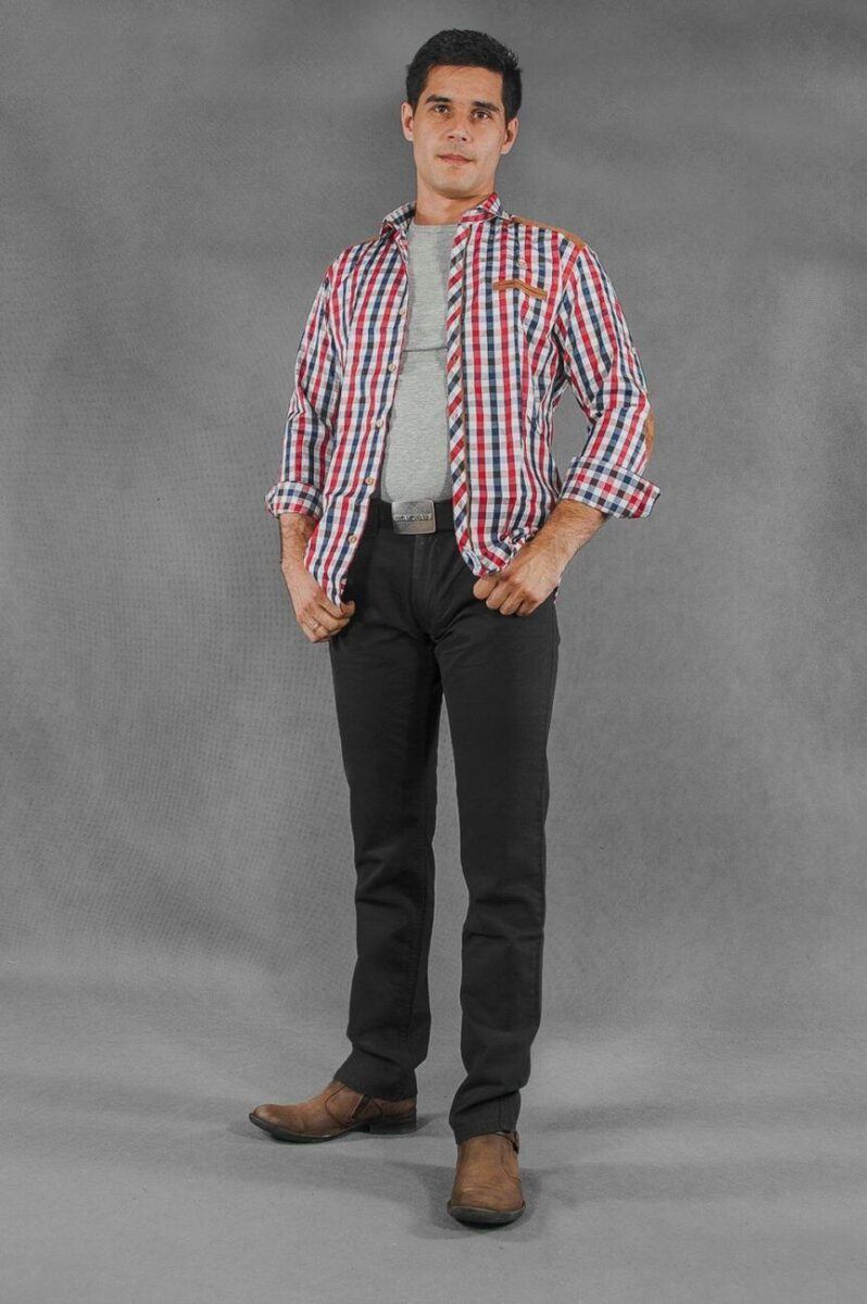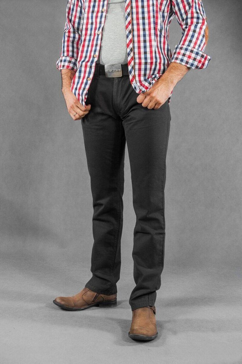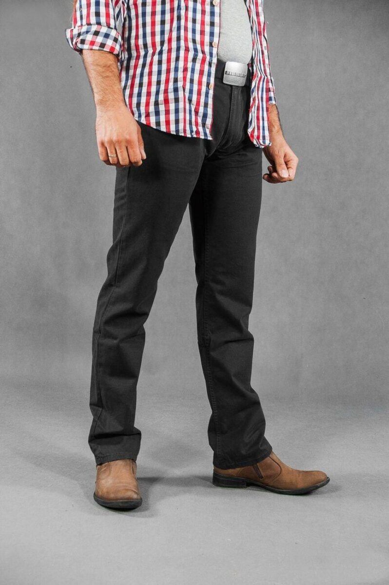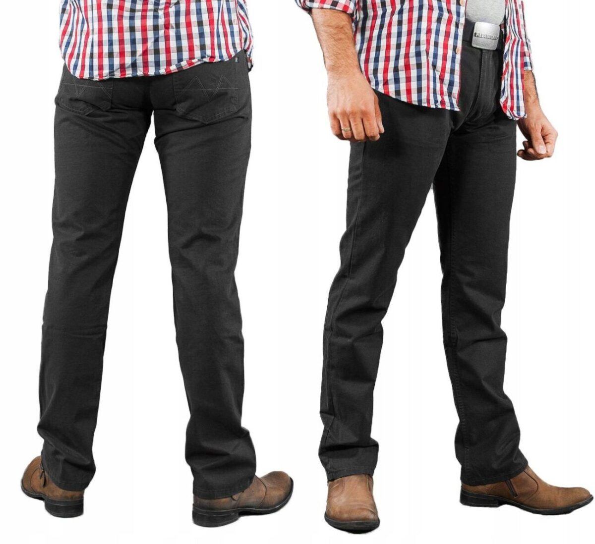 Niesłychanie wygodne i praktyczne podczas użytkowania spodnie męskie bawełniane polskiej firmy RADER ze standardowym stanem i klasyczną lekko zwężaną nogawką to jeden z najczęściej wybieranych modeli spodni. Wykonane z wysokiej jakości trwałej i mocnej tkaniny bawełnianej „Denim Super Black” z niewielkim dodatkiem elastanu (streczu) o gęstym, drobnym splocie i jednolitym czarnym wybarwieniu. Niewielki dodatek streczu sprawia, że spodnie są bardziej elastyczne i bardzo dobrze dopasowują się do każdej sylwetki. Pozwalają na pełną swobodę ruchów, co daje komfort przy siadaniu i zapewnia ogromny komfort noszenia. Zapinane są na kryty zamek błyskawiczny i guzik sygnowany logiem firmy. Z przodu mają dwie kieszonki zaokrąglone oraz mniejszą kieszonkę tzw. bilonówkę, a na tyle klasyczne kieszenie naszywane jak w typowych spodniach jeansowych. W pasie szlufki umożliwiające stylizacje z paskiem. Najbardziej podatne na uszkodzenia miejsca wzmocnione są dodatkowymi przeszyciami oraz nitami.