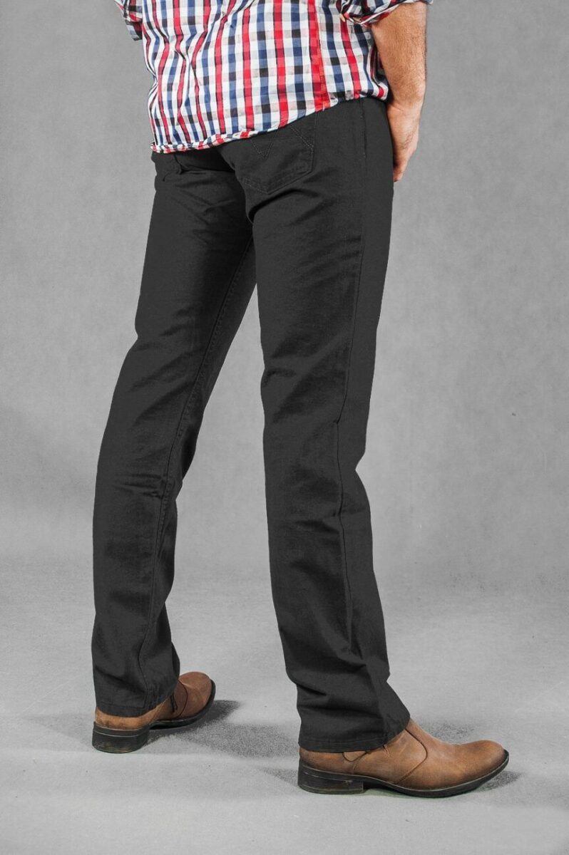 Niesłychanie wygodne i praktyczne podczas użytkowania spodnie męskie bawełniane polskiej firmy RADER ze standardowym stanem i klasyczną lekko zwężaną nogawką to jeden z najczęściej wybieranych modeli spodni. Wykonane z wysokiej jakości trwałej i mocnej tkaniny bawełnianej „Denim Super Black” z niewielkim dodatkiem elastanu (streczu) o gęstym, drobnym splocie i jednolitym czarnym wybarwieniu. Niewielki dodatek streczu sprawia, że spodnie są bardziej elastyczne i bardzo dobrze dopasowują się do każdej sylwetki. Pozwalają na pełną swobodę ruchów, co daje komfort przy siadaniu i zapewnia ogromny komfort noszenia. Zapinane są na kryty zamek błyskawiczny i guzik sygnowany logiem firmy. Z przodu mają dwie kieszonki zaokrąglone oraz mniejszą kieszonkę tzw. bilonówkę, a na tyle klasyczne kieszenie naszywane jak w typowych spodniach jeansowych. W pasie szlufki umożliwiające stylizacje z paskiem. Najbardziej podatne na uszkodzenia miejsca wzmocnione są dodatkowymi przeszyciami oraz nitami.