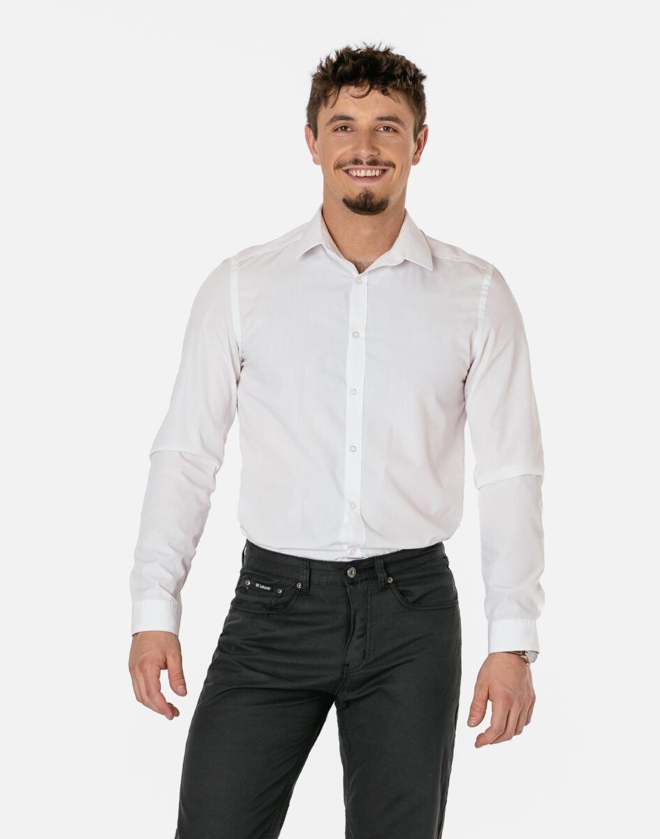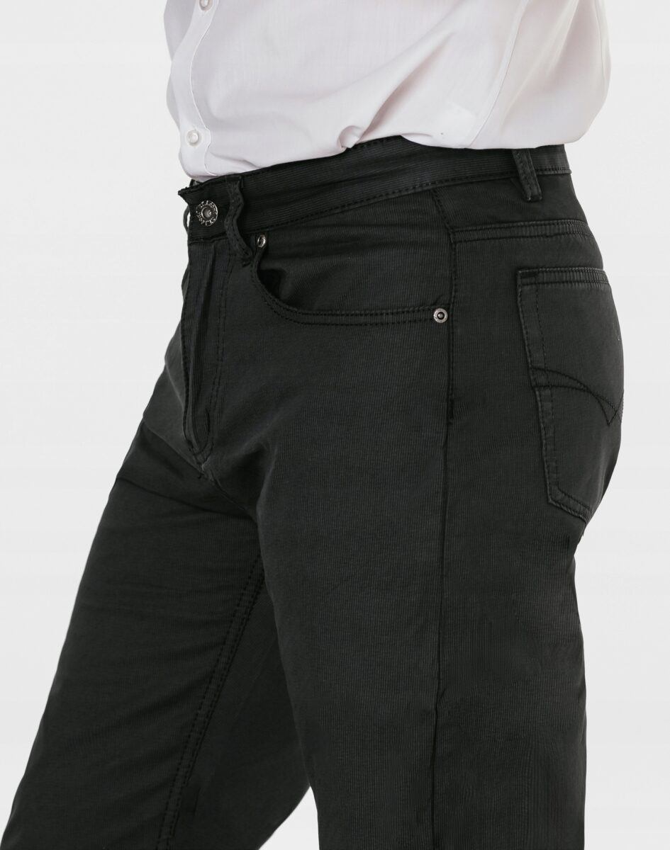 Fason typu REGULAR FIT czyli model z prostymi nogawkami i standardowym stanem, stylowy i równocześnie wygodny, wyraźnie wysmuklający męską sylwetkę. Jest to wszechstronny krój, który ma świetnie wyprofilowane nogawki, pasujący dla panów o standardowej budowie a także tych nieco masywniejszych. Idealne nie tylko na co dzień lecz również jako element stroju do pracy. Doskonale wpisują się w światowe modowe trendy i są przy tym wygodne i trwałe. W zależności od dopasowanego do nich elementu garderoby będziesz zawsze odpowiednio ubrany na każdą okazję, zarówno na „sportowo” jak i na „elegancko” bo ta sama para spodni z marynarką czy koszulą tworzy styl bardziej formalny, natomiast z T-shirtem doskonale nadaje się na weekendowe spotkania. Idealny wybór dla mężczyzn ceniących nowoczesne rozwiązania, sportowy wygodny styl jak i casualową elegancję.