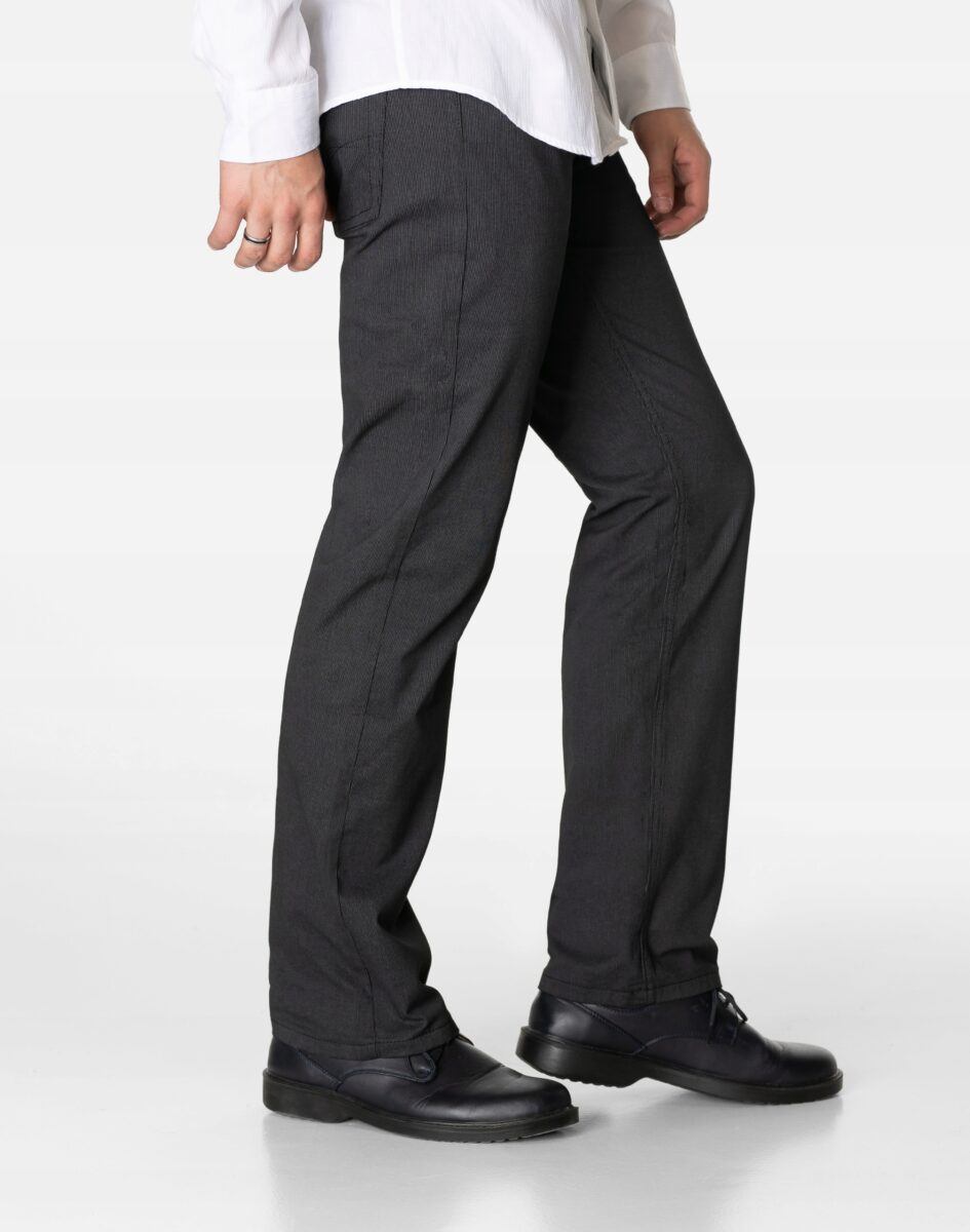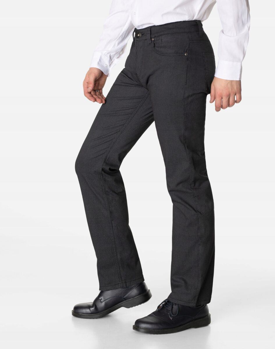 Cienkie bawełnianespodnie męskie o klasycznym kroju, to wygodne rozwiązanie na ciepłe i gorące dni wiosny i lata oraz niezbędny element wakacyjnej garderoby oraz udanych letnich stylizacji. Przewiewne i wygodne, idealne na co dzień jako element eleganckiego, męskiego, casualowego stroju, czyniąc go lekkim i dostosowanym do wysokich temperatur. Zapinane na kryty zamek błyskawiczny i metalowy guzik sygnowany logiem firmy. Z przodu mają dwie wpuszczane kieszenie na dłonie oraz mniejszą kieszonkę tzw. bilonówkę. Z tyłu dwie naszywane kieszenie jak w typowych spodniach jeansowych. W pasie szlufki umożliwiające stylizacje z paskiem. Najbardziej podatne na uszkodzenia miejsca wzmocnione są dodatkowymi przeszyciami oraz nitami.